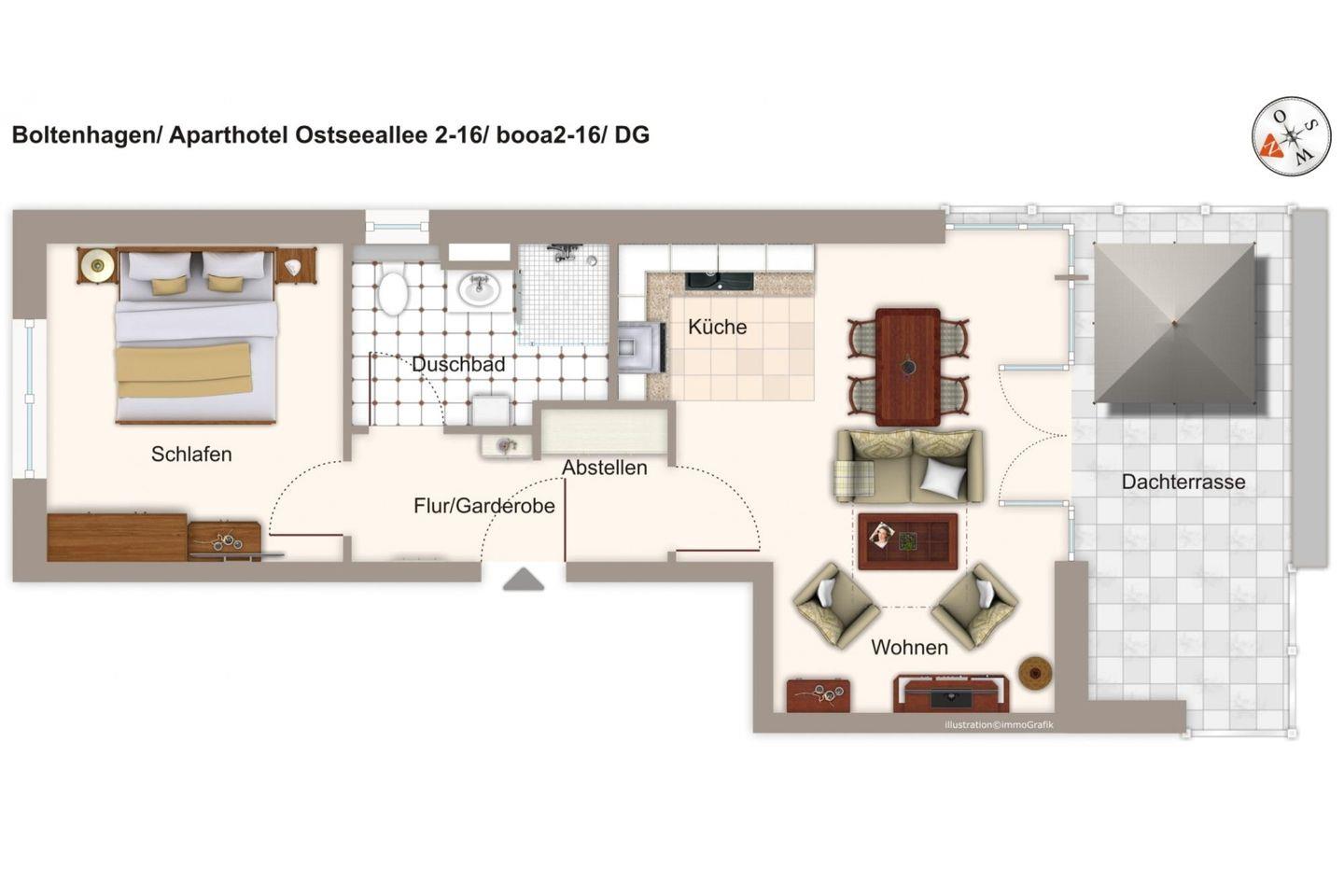 Das 55 m² große und familienfreundliche 2-Zimmer Apartment ist für bis zu 4 Personen geeignet. Besonders hervorzuheben ist die wunderschön gelegene Dachterrasse in südöstlicher Lage; hier könnt ihr vom Frühstück bis zum Nachmittag den Sonnenschein und das milde Klima der Ostsee genießen.