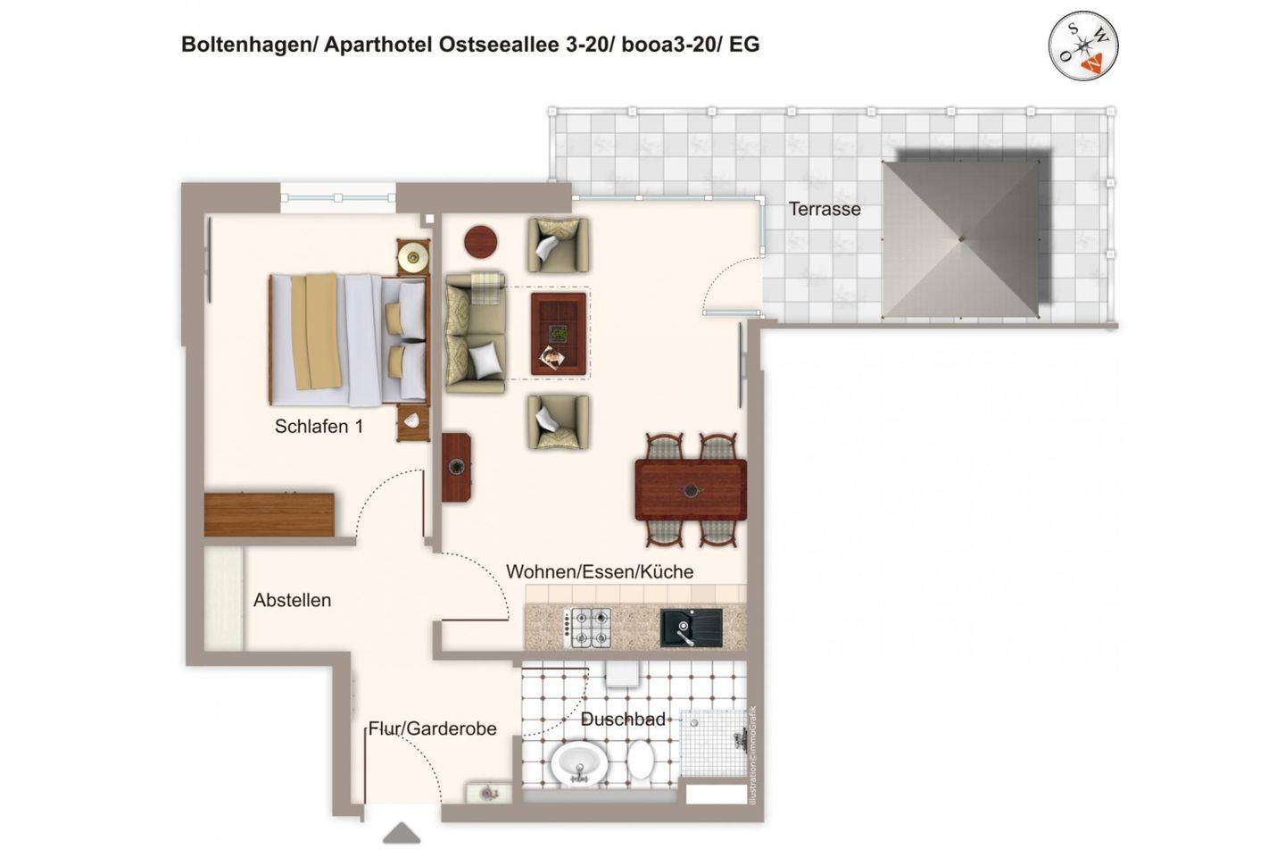 Das 57 m² große und barrierearme 2-Zimmer Apartment ist für bis zu 4 Personen geeignet. Besonders hervorzuheben ist die sonnenreiche und großzügige Terrasse in Süd-West Lage; hier lässt sich bis in den Abend hinein die Sonne und das Ostseeklima genießen.