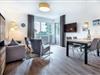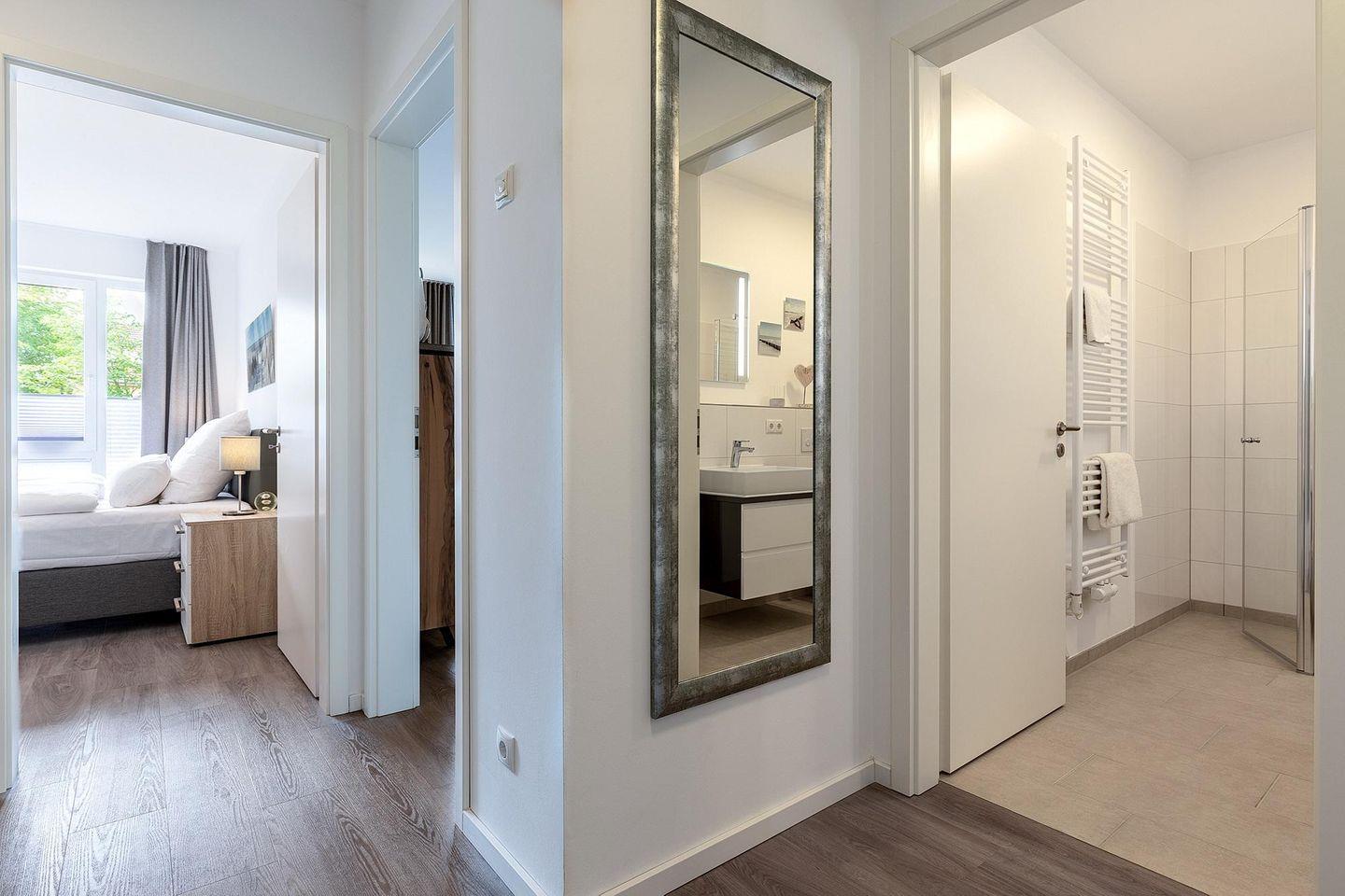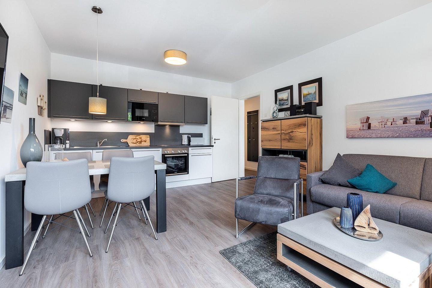 Das familienfreundliche und moderne Nichtraucher-Apartment verfügt über Fußbodenheizung, bodentiefe Fenster mit 3-fach Isolierung, kostenfreies WLAN und eine voll ausgestattete offene Küche mit Geschirrspüler, Gefrierfach, Kaffeemaschine, Toaster, Wasserkocher, Backofen und Mikrowelle sowie über einen Essbereich. Im Wohnbereich befindet sich eine Doppelschlafcouch (1,60 x 2,00 m) und ein großer Flatscreen-TV mit Blu-ray-Player. Das separate Schlafzimmer ist mit einem modernen Boxspringbett (1,80 x 2,00 m) und einem Flatscreen-TV ausgestattet. Ein Kinderbett kann gegen Entgelt im Wohnbereich aufgestellt werden und auf Wunsch könnt ihr einen Kinderhochstuhl hinzubuchen. Im stilvollen Badezimmer befinden sich eine ebenerdige Dusche, ein Waschtisch mit Föhn, Kosmetikspiegel und Handtuchheizkörper. Das Apartment verfügt über einen Flur mit Garderobe. Nach einem erholsamen Urlaubstag lässt es sich auf der mit Gartenmöbeln und Sonnenschirm ausgestatteten und sonnigen Terrasse, herrlich entspannen. Die Terrasse ist vom Wohnzimmer aus begehbar.