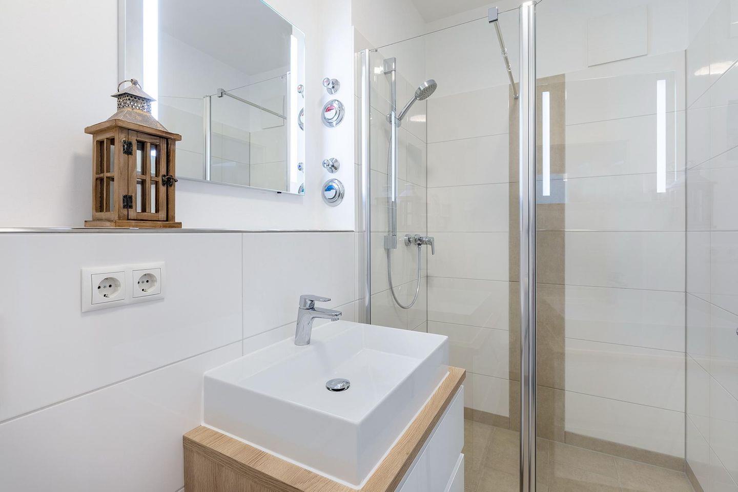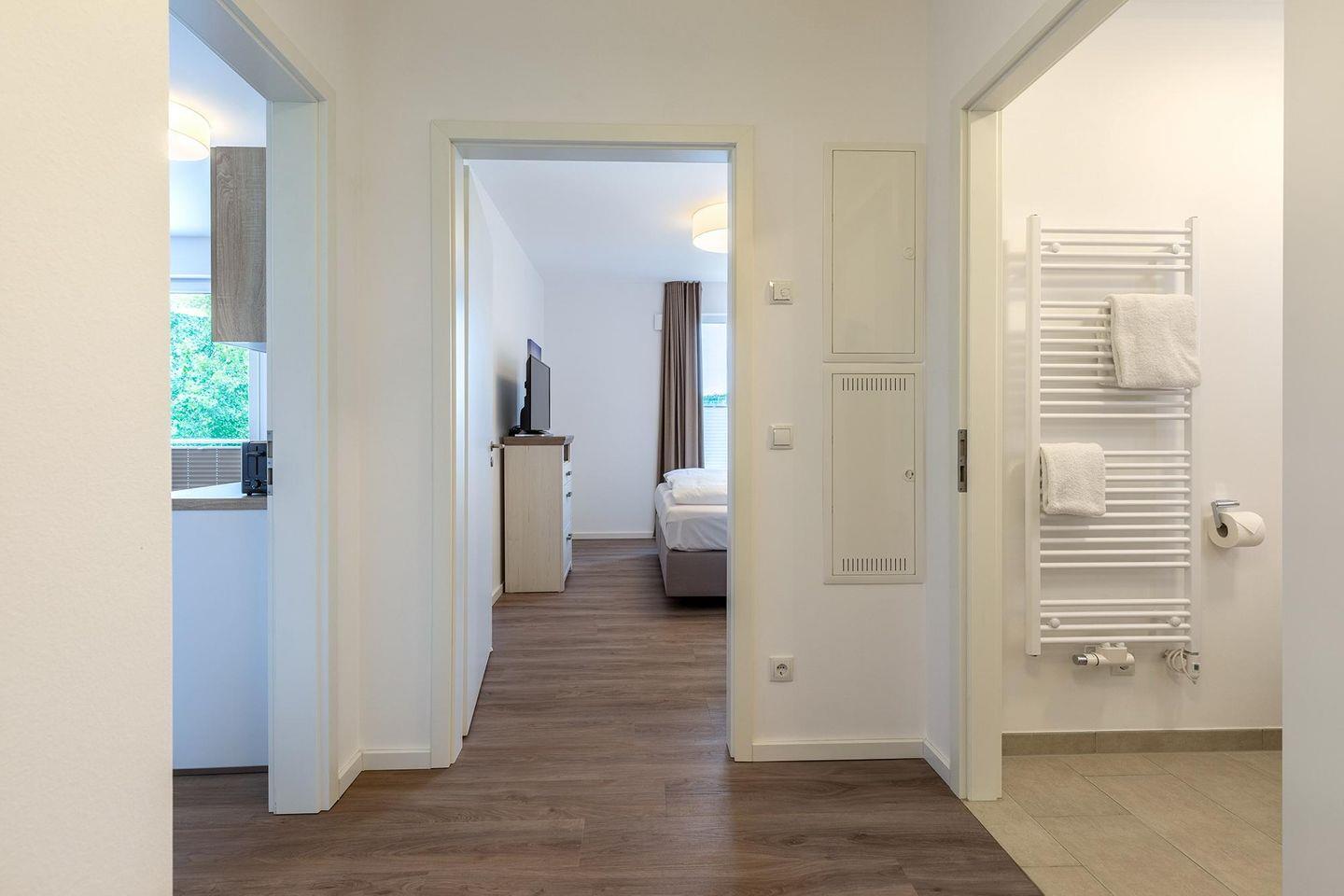 Das helle und moderne Nichtraucher-Apartment verfügt über Fußbodenheizung, bodentiefe Fenster mit 3-fach Isolierung, kostenfreies WLAN und eine voll ausgestattete offene Küche mit Geschirrspüler, Gefrierfach, Kaffeemaschine, Toaster, Wasserkocher, Backofen und Mikrowelle sowie über einen Essbereich. Im Wohnbereich befindet sich eine Doppelschlafcouch (1,60 x 2,00 m) und ein großer Flatscreen-TV. Das separate Schlafzimmer ist mit einem modernen Boxspringbett (1,80 x 2,00 m) und einem Flatscreen-TV ausgestattet. Ein Kinderbett kann gegen Entgelt aufgestellt werden und auf Wunsch könnt ihr einen Kinderhochstuhl hinzubuchen. Im stilvollen Badezimmer befinden sich eine ebenerdige Dusche, ein Waschtisch mit Föhn, Kosmetikspiegel und Handtuchheizkörper. Das Apartment verfügt über einen Flur mit Garderobe. Auf dem mit Gartenmöbeln und Sonnenschirm ausgestatteten West-Balkon mit Landblick könnt ihr die Sonne genießen, die hier bis in den Abend scheint. Der Balkon ist vom Wohnbereich aus begehbar. Bis auf eine Schwelle zum Balkon ist das Apartment barrierefrei konzipiert.