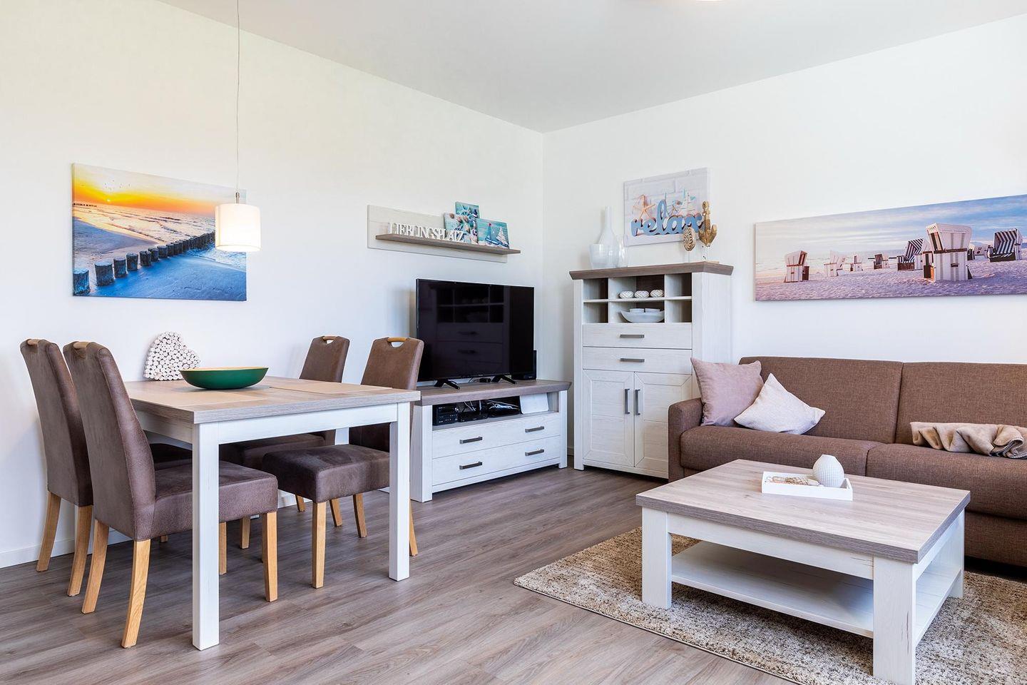 Das 57 m² große und familienfreundliche 2-Zimmer Apartment ist für bis zu 4 Personen geeignet. Besonders hervorzuheben ist der sonnenreiche und großzügige Balkon in West-Lage mit Blick ins Grüne; hier könnt ihr noch am Abend die Sonne und das milde Klima der Ostsee genießen.