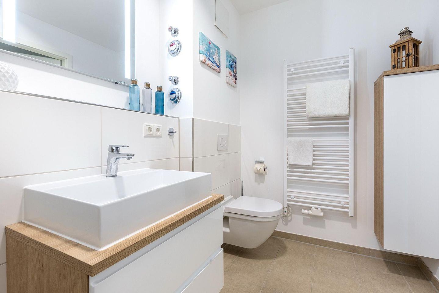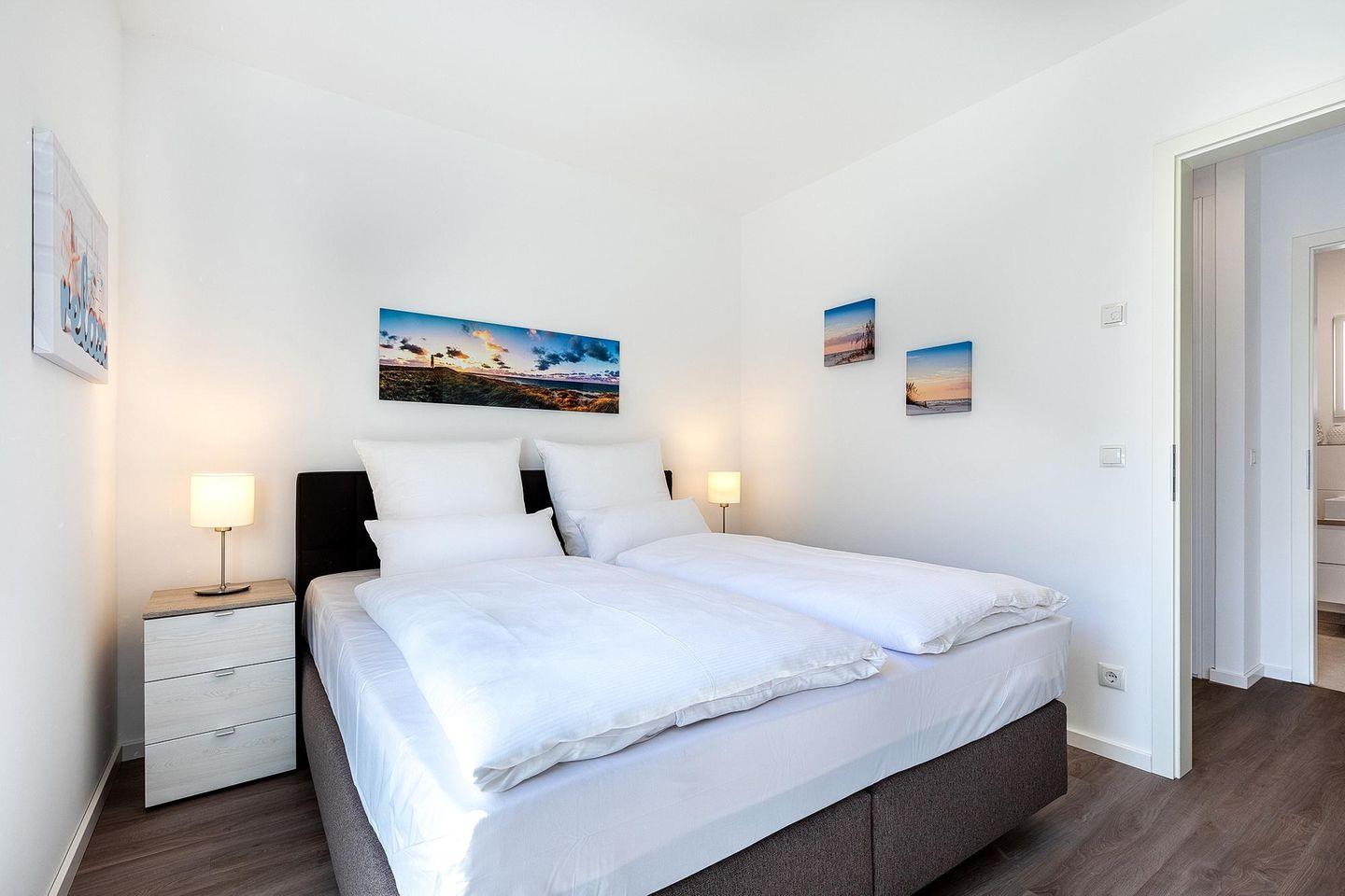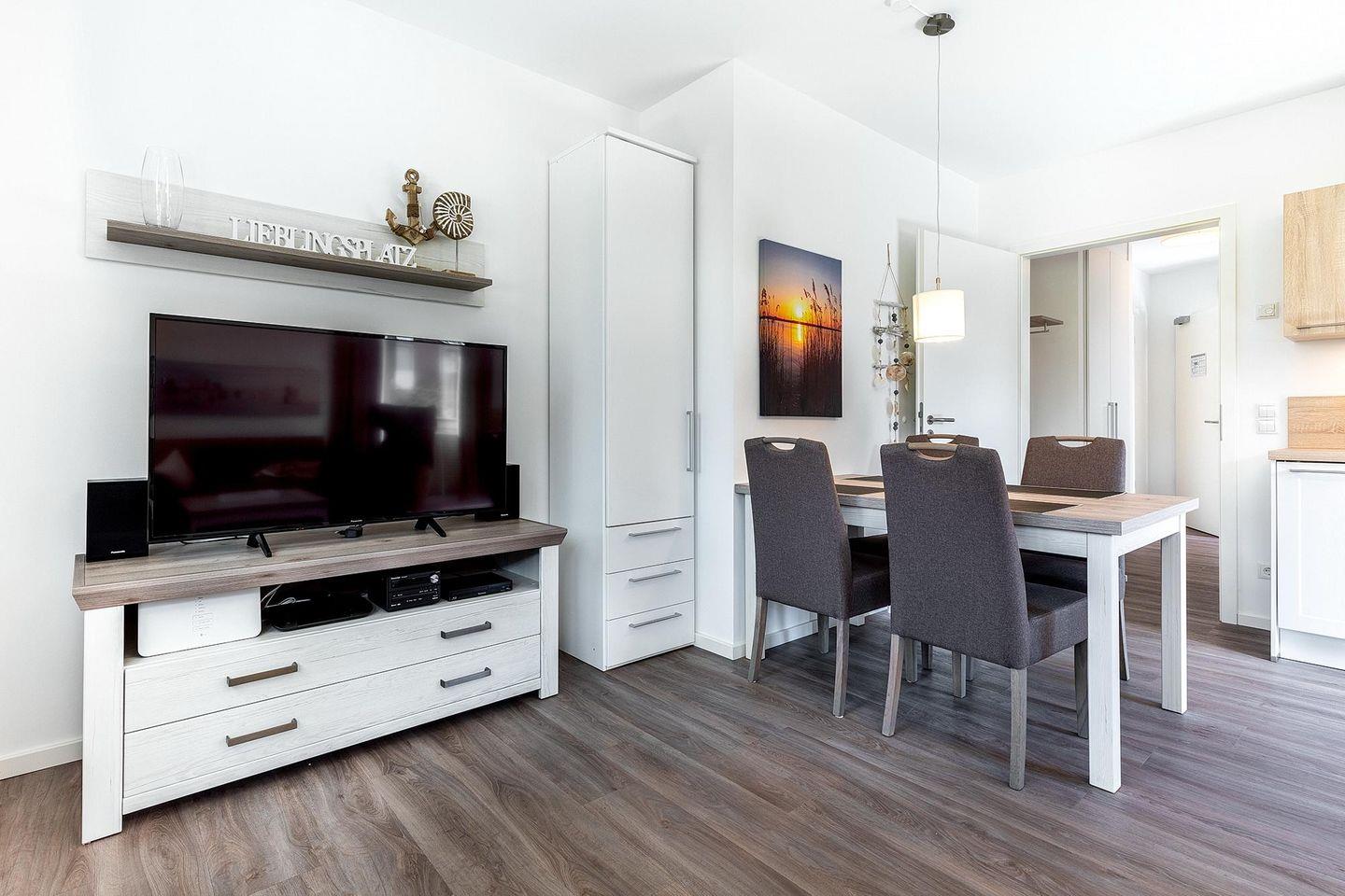 Das familienfreundliche und moderne Nichtraucher-Apartment verfügt über Fußbodenheizung, bodentiefe Fenster mit 3-fach Isolierung, kostenfreies WLAN und eine voll ausgestattete offene Küche mit Geschirrspüler, Gefrierfach, Kaffeemaschine, Toaster, Wasserkocher, Backofen und Mikrowelle sowie über einen Essbereich. Im Wohnbereich befindet sich eine Doppelschlafcouch (1,60 x 2,00 m) und ein großer Flatscreen-TV mit Blu-ray-Player. Das separate Schlafzimmer ist mit einem modernen Boxspringbett (1,80 x 2,00 m) und einem Flatscreen-TV ausgestattet. Ein Kinderbett kann gegen Entgelt im Wohnbereich aufgestellt werden und auf Wunsch könnt ihr einen Kinderhochstuhl hinzubuchen. Im stilvollen Badezimmer befinden sich eine ebenerdige Dusche, ein Waschtisch mit Föhn, Kosmetikspiegel und Handtuchheizkörper. Das Apartment verfügt über einen Flur mit Garderobe. Nach einem erholsamen Urlaubstag lässt es sich auf der mit Gartenmöbeln und Sonnenschirm ausgestatteten und sonnigen Terrasse, herrlich entspannen. Die Terrasse ist vom Wohnzimmer aus begehbar.