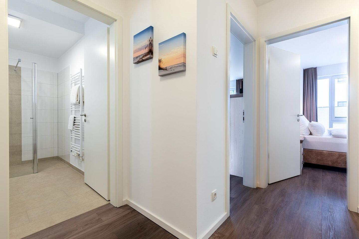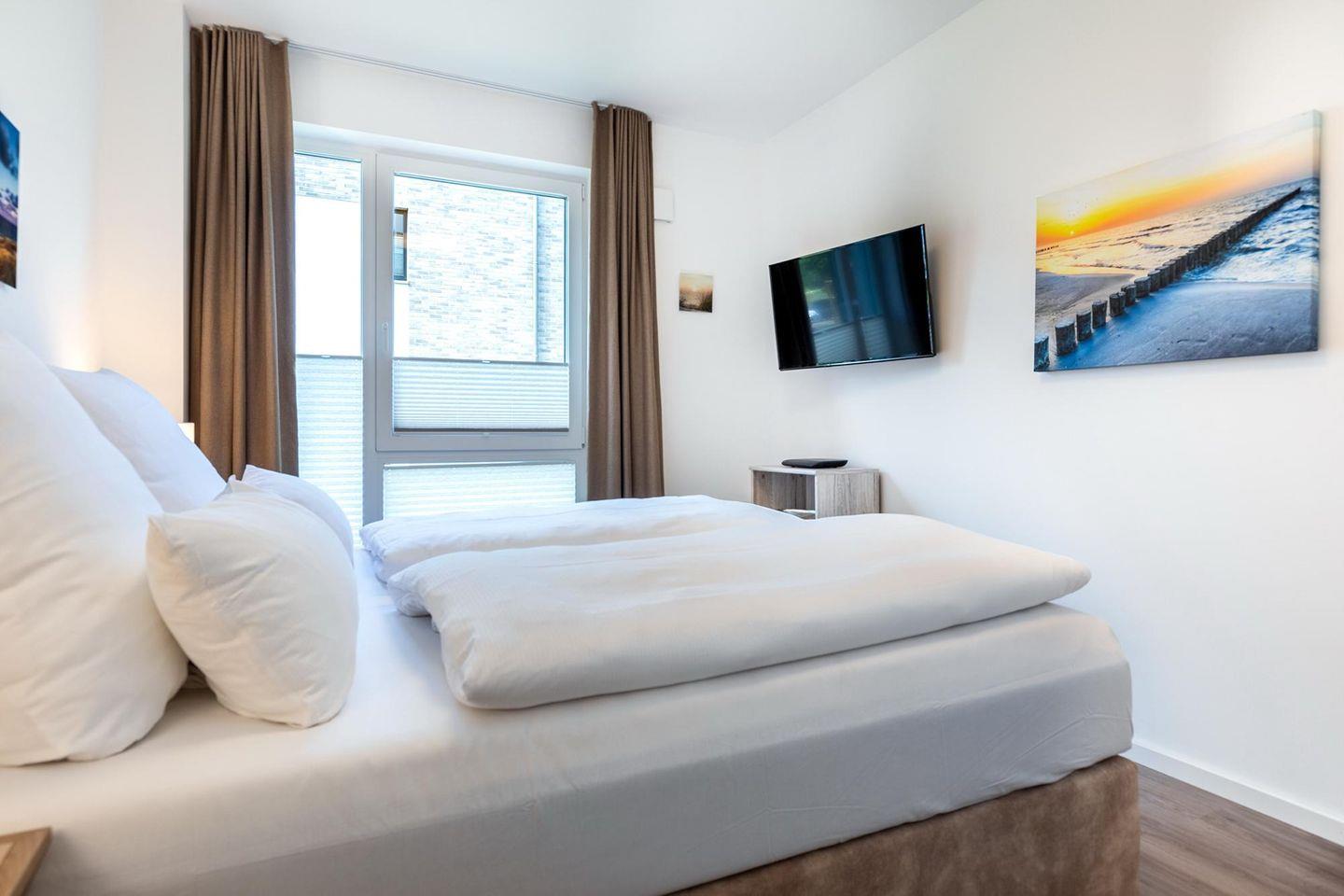 Das familienfreundliche und moderne Nichtraucher-Apartment verfügt über Fußbodenheizung, bodentiefe Fenster mit 3-fach Isolierung, kostenfreies WLAN und eine voll ausgestattete offene Küche mit Geschirrspüler, Gefrierfach, Kaffeemaschine, Toaster, Wasserkocher, Backofen und Mikrowelle sowie über einen Essbereich. Im Wohnbereich befindet sich eine Doppelschlafcouch (1,60 x 2,00 m) und ein großer Flatscreen-TV mit Blu-ray-Player. Das separate Schlafzimmer ist mit einem modernen Boxspringbett (1,80 x 2,00 m) und einem Flatscreen-TV ausgestattet. Im stilvollen Badezimmer befinden sich eine ebenerdige Dusche, ein Waschtisch mit Föhn, Kosmetikspiegel und Handtuchheizkörper. Das Apartment verfügt über einen Flur mit Garderobe. Nach einem erholsamen Urlaubstag lässt es sich auf der mit Gartenmöbeln und Sonnenschirm ausgestatteten und sonnigen Terrasse, herrlich entspannen. Die Terrasse ist vom Wohnzimmer aus begehbar.