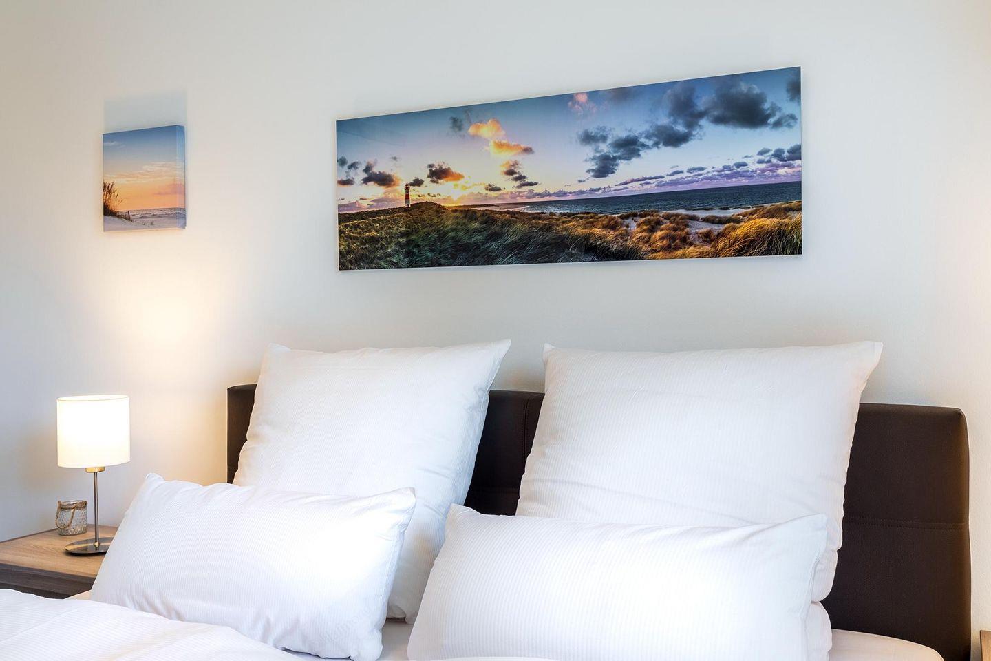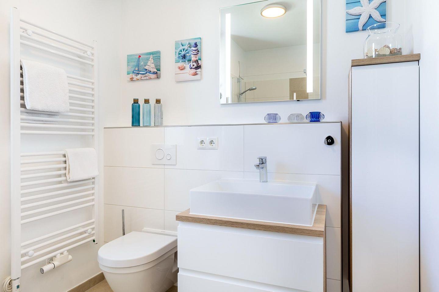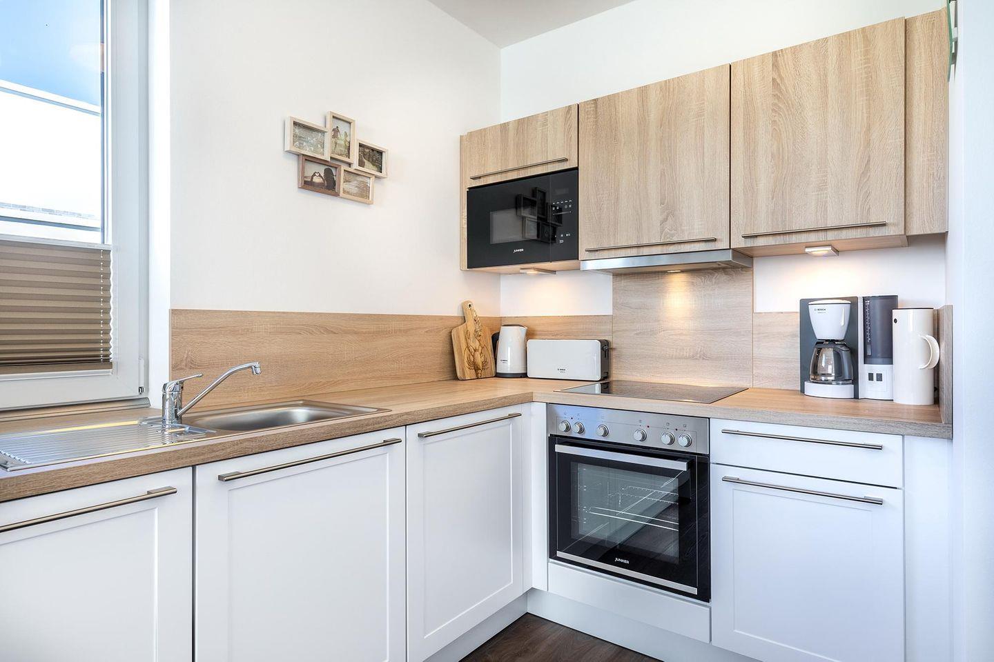 Das helle und moderne Nichtraucher-Apartment verfügt über Fußbodenheizung, bodentiefe Fenster mit 3-fach Isolierung, kostenfreies WLAN und eine voll ausgestattete offene Küche mit Geschirrspüler, Gefrierfach, Kaffeemaschine, Toaster, Wasserkocher, Backofen und Mikrowelle sowie über einen Essbereich. Im Wohnbereich befindet sich eine Doppelschlafcouch (1,60 x 2,00 m) und ein großer Flatscreen-TV mit Blu-ray-Player. Das separate Schlafzimmer ist mit einem modernen Boxspringbett (1,80 x 2,00 m) und einem Flatscreen-TV ausgestattet. Ein Kinderbett kann gegen Entgelt im Wohnbereich aufgestellt werden und auf Wunsch könnt ihr einen Kinderhochstuhl hinzubuchen. Im stilvollen Badezimmer befinden sich eine ebenerdige Dusche, ein Waschtisch mit Föhn, Kosmetikspiegel und Handtuchheizkörper. Das Apartment verfügt über einen Flur mit Garderobe. Auf dem mit Gartenmöbeln und Sonnenschirm ausgestatteten Balkon könnt ihr nach Lust und Laune die Sonne genießen, die hier bis in den Abend scheint. Der Balkon ist vom Wohnbereich aus begehbar. Bis auf eine Schwelle zum Balkon ist das Apartment barrierefrei konzipiert. Das Apartment verfügt über Fliegengitter vor den Fenstern.