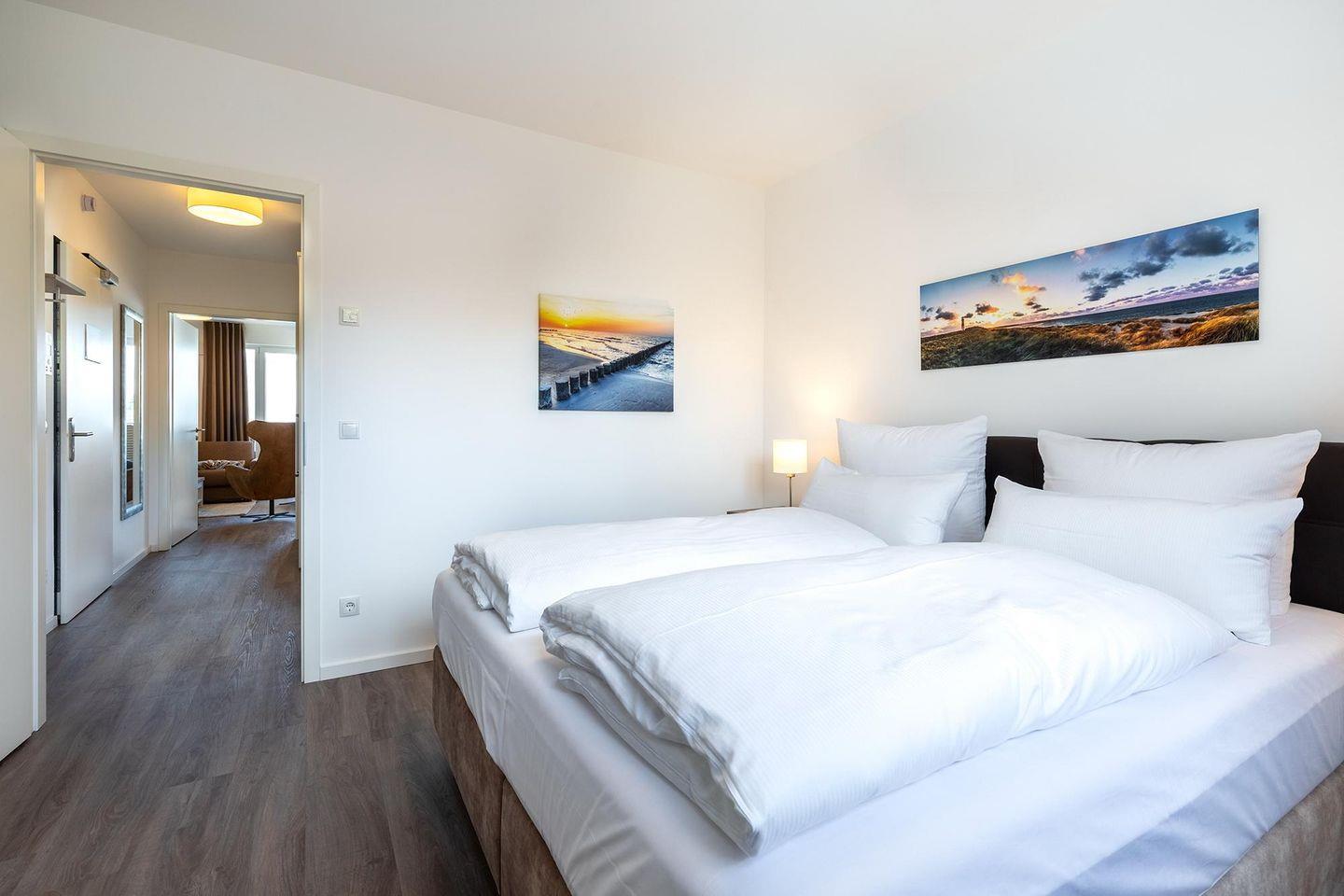 Das helle und moderne Nichtraucher-Apartment verfügt über Fußbodenheizung, bodentiefe Fenster mit 3-fach Isolierung, kostenfreies WLAN und eine voll ausgestattete offene Küche mit Geschirrspüler, Gefrierfach, Kaffeemaschine, Toaster, Wasserkocher, Backofen und Mikrowelle sowie über einen Essbereich. Im Wohnbereich befindet sich eine Doppelschlafcouch (1,60 x 2,00 m) und ein großer Flatscreen-TV mit Blu-ray-Player. Das separate Schlafzimmer ist mit einem modernen Boxspringbett (1,80 x 2,00 m) und Flatscreen-TV ausgestattet. Das großzügig konzipierte und stilvolle Badezimmer verfügt über eine ebenerdige Dusche, WC, Waschtisch, Föhn, Kosmetikspiegel und Handtuchheizkörper. Das Apartment verfügt über einen geräumigen Flur mit Garderobe.