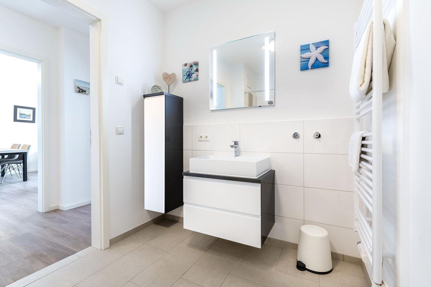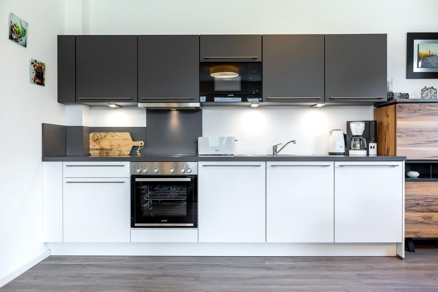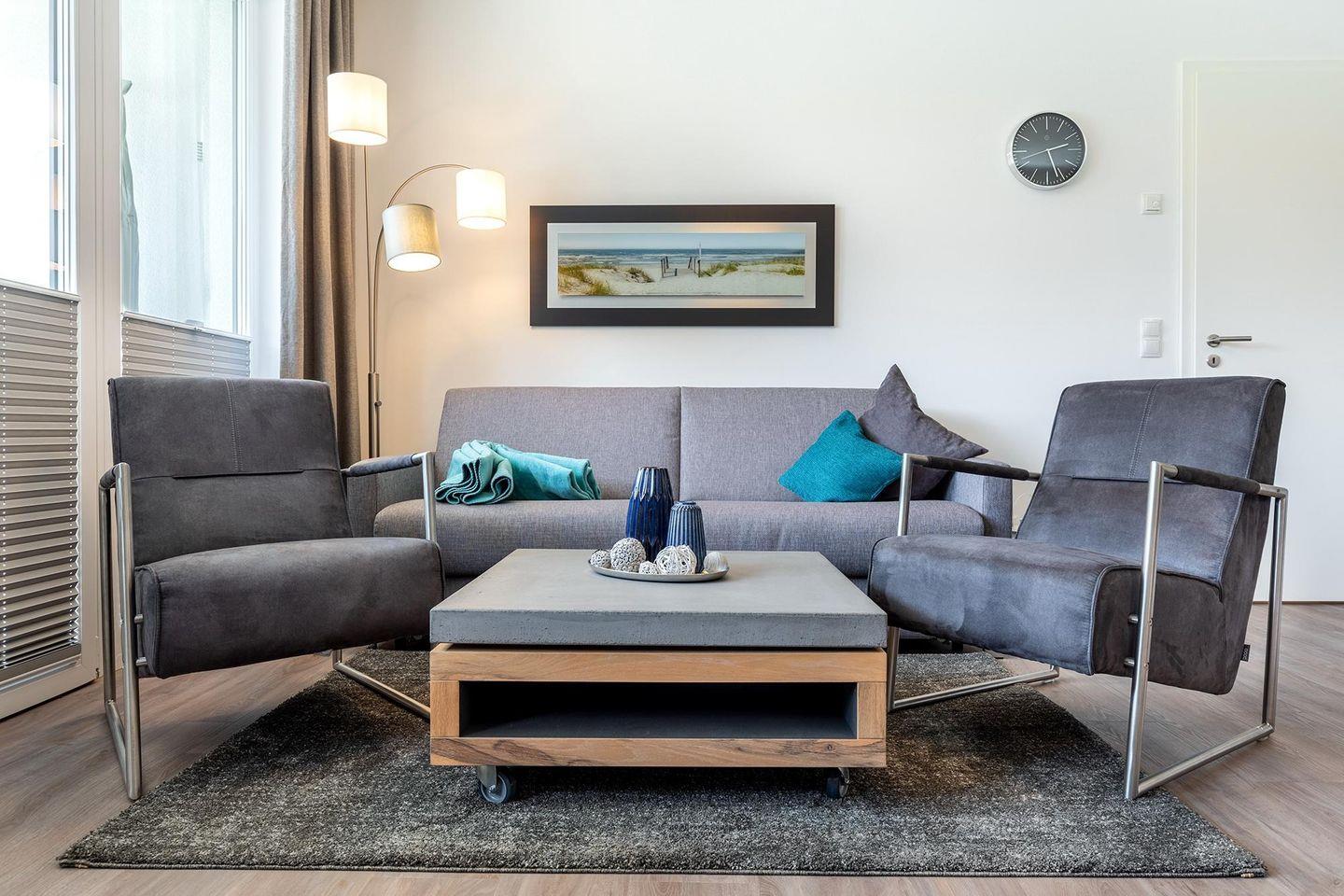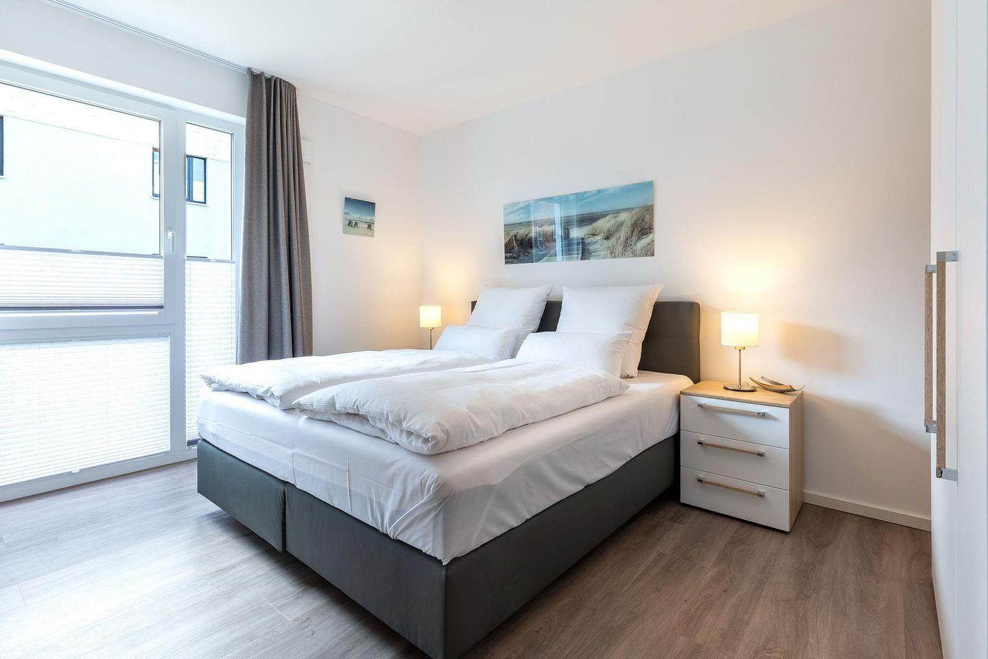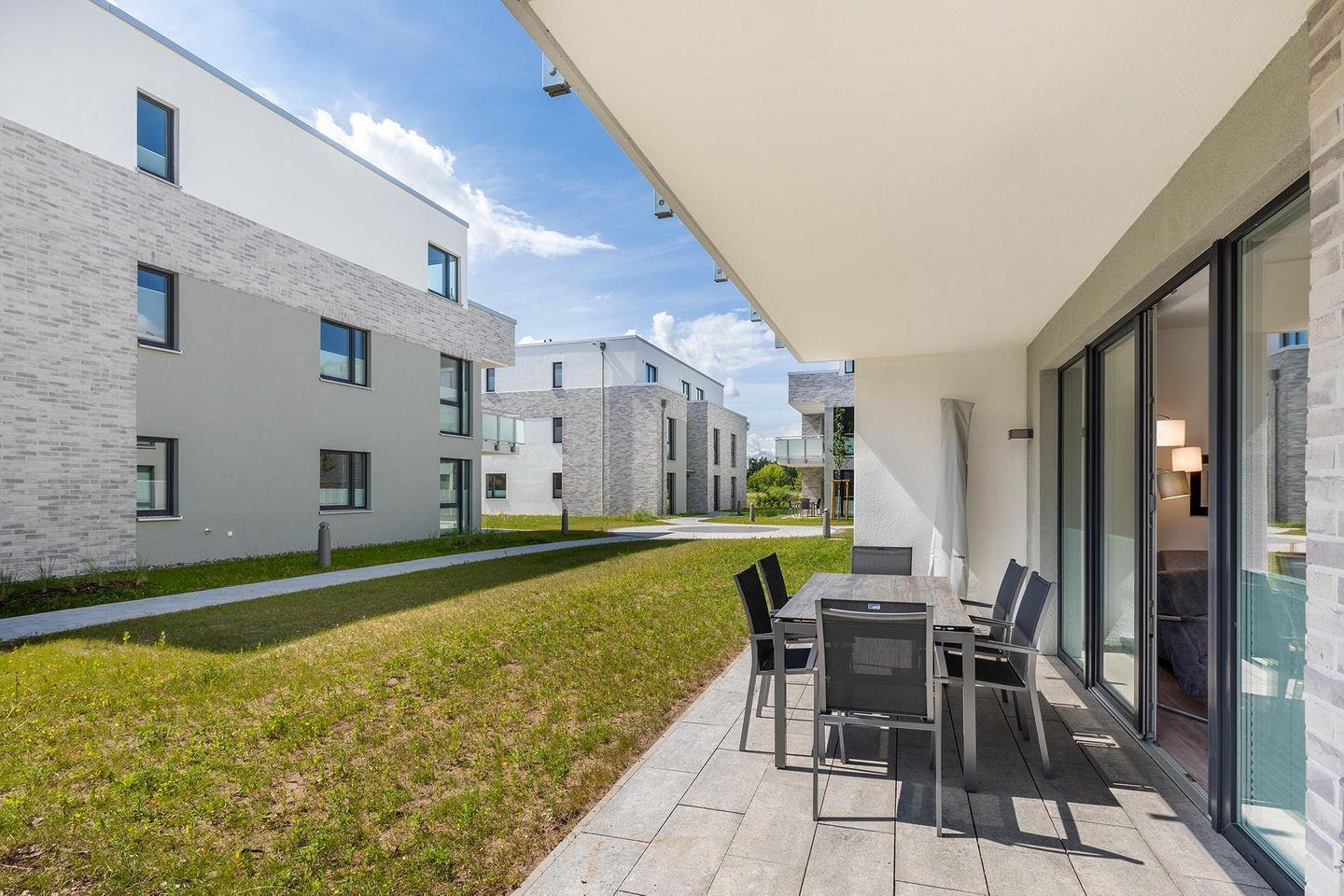 Das familienfreundliche und moderne Nichtraucher-Apartment verfügt über Fußbodenheizung, bodentiefe Fenster mit 3-fach Isolierung, kostenfreies WLAN und eine voll ausgestattete offene Küche mit Geschirrspüler, Gefrierfach, Kaffeemaschine, Toaster, Wasserkocher, Backofen und Mikrowelle sowie über einen Essbereich. Im Wohnbereich befindet sich eine Doppelschlafcouch (1,60 x 2,00 m) und ein großer Flatscreen-TV mit Blu-ray-Player. Beide separaten Schlafzimmer sind jeweils mit einem modernen Boxspringbett (1,80 x 2,00 m) und Flatscreen-TV ausgestattet. Ein Kinderbett kann gegen Entgelt aufgestellt werden und auf Wunsch könnt ihr einen Kinderhochstuhl hinzubuchen. Die stilvollen Badezimmer verfügen jeweils über eine ebenerdige Dusche, WC, Waschtisch, Föhn, Kosmetikspiegel und Handtuchheizkörper. Das Apartment verfügt über einen großzügigen Flur mit Garderobe. Auf der mit Gartenmöbeln und Sonnenschirm ausgestatteten Terrasse lässt sich herrlich entspannen, sonnenbaden und gesellig beisammen sitzen. Die Terrasse ist vom Wohn-Essbereich aus begehbar.