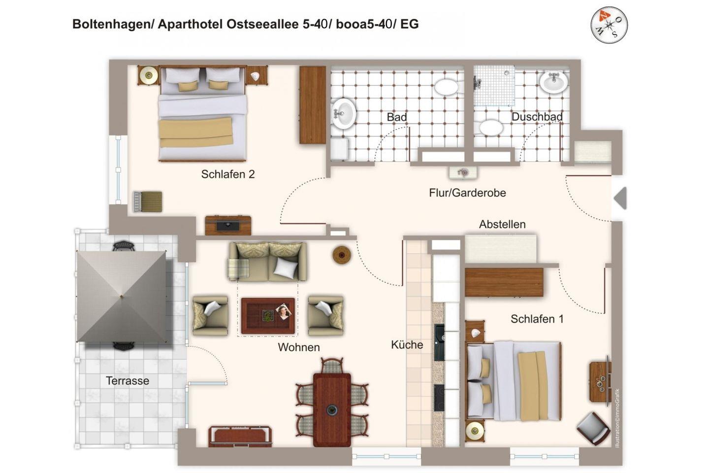 Das 81 m² große und barrierearme 3-Zimmer Apartment ist für bis zu 6 Personen geeignet. Besonders hervorzuheben ist die großzügige Terrasse in südöstlicher Lage auf der ihr gesellige Stunden verbringen und dabei die Sonne und das milde Klima der Ostsee genießen könnt. Das Apartment verfügt über den Luxus von zwei Bädern, so beginnt der Tag schon morgens vollkommen entspannt.