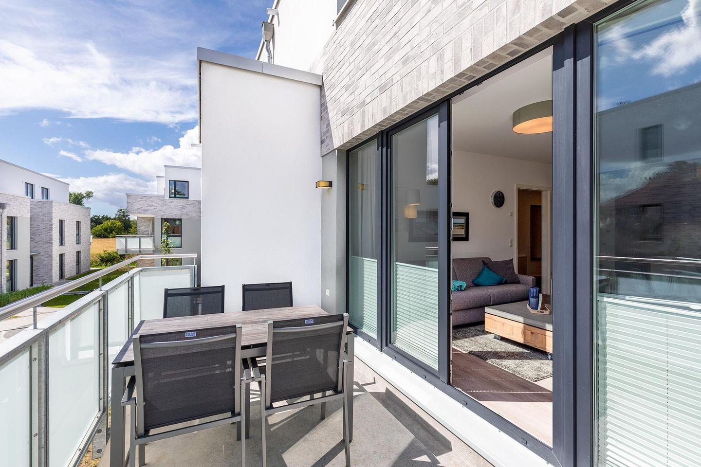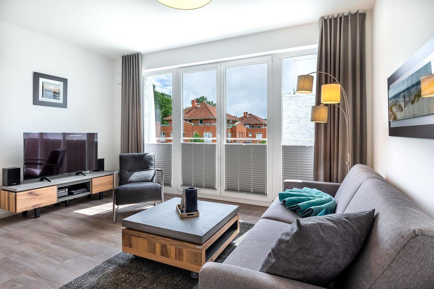 Das helle und moderne Nichtraucher-Apartment verfügt über Fußbodenheizung, bodentiefe Fenster mit 3-fach Isolierung, kostenfreies WLAN und eine voll ausgestattete offene Küche mit Geschirrspüler, Gefrierfach, Kaffeemaschine, Toaster, Wasserkocher, Backofen und Mikrowelle sowie über einen Essbereich. Im großzügig konzipierten Wohnbereich befindet sich eine Doppelschlafcouch (1,60 x 2,00 m) und ein großer Flatscreen-TV mit Blu-ray-Player. Beide separaten Schlafzimmer sind jeweils mit einem modernen Boxspringbett (1,80 x 2,00 m) und Flatscreen-TV ausgestattet. Ein Kinderbett kann gegen Entgelt aufgestellt werden und auf Wunsch könnt ihr einen Kinderhochstuhl hinzubuchen. Die stilvollen Badezimmer verfügen jeweils über eine ebenerdige Dusche, WC, Waschtisch, Föhn, Kosmetikspiegel und Handtuchheizkörper. Das Apartment verfügt über einen großzügigen Flur mit Garderobe. Auf derm mit Gartenmöbeln und Sonnenschirm ausgestatteten Balkon lässt sich herrlich entspannen, sonnenbaden und gesellig beisammen sitzen. Der Balkon ist vom Wohn-Essbereich aus begehbar. Bis auf eine Schwelle zum Balkon ist das Apartment barrierefrei konzipiert.
