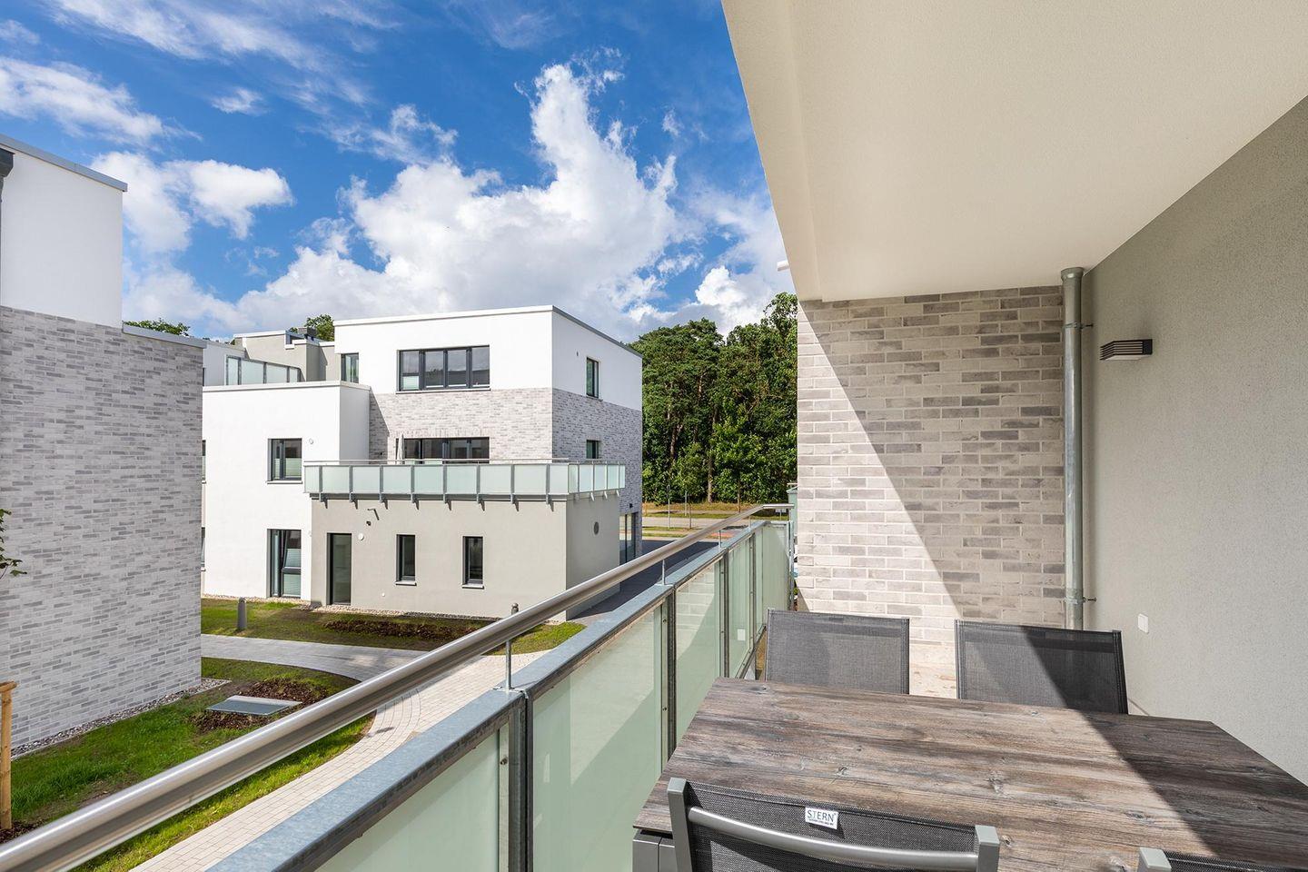 Auf dem mit Gartenmöbeln und Sonnenschirm ausgestatteten, sonnenreichen Balkon lässt sich herrlich entspannen, sonnenbaden und gesellig beisammen sitzen. Der Balkon ist vom Wohn-Essbereich aus begehbar. Bis auf eine Schwelle zum Balkon ist das Apartment barrierefrei konzipiert.