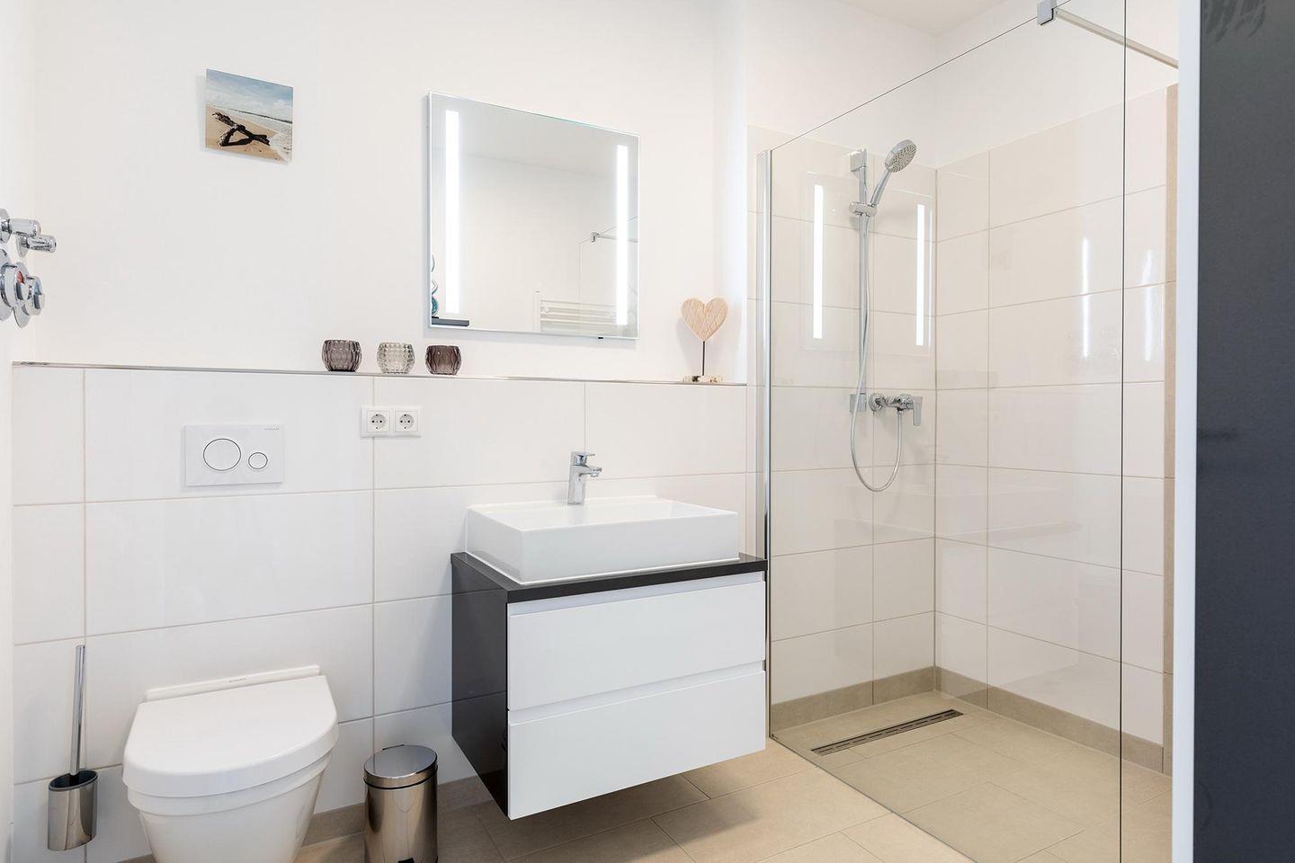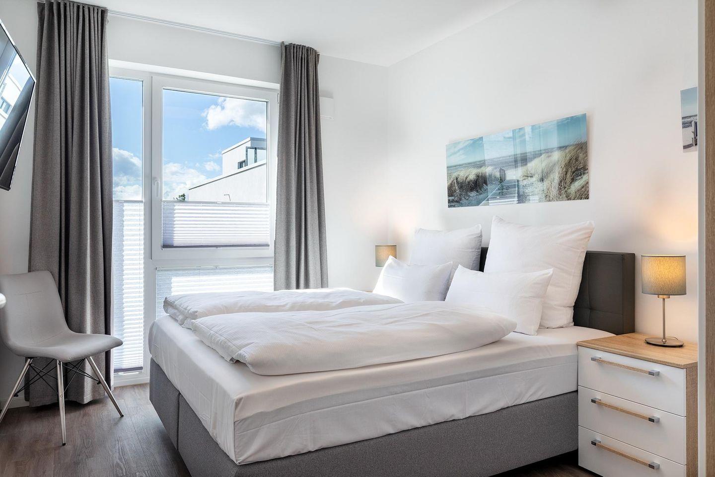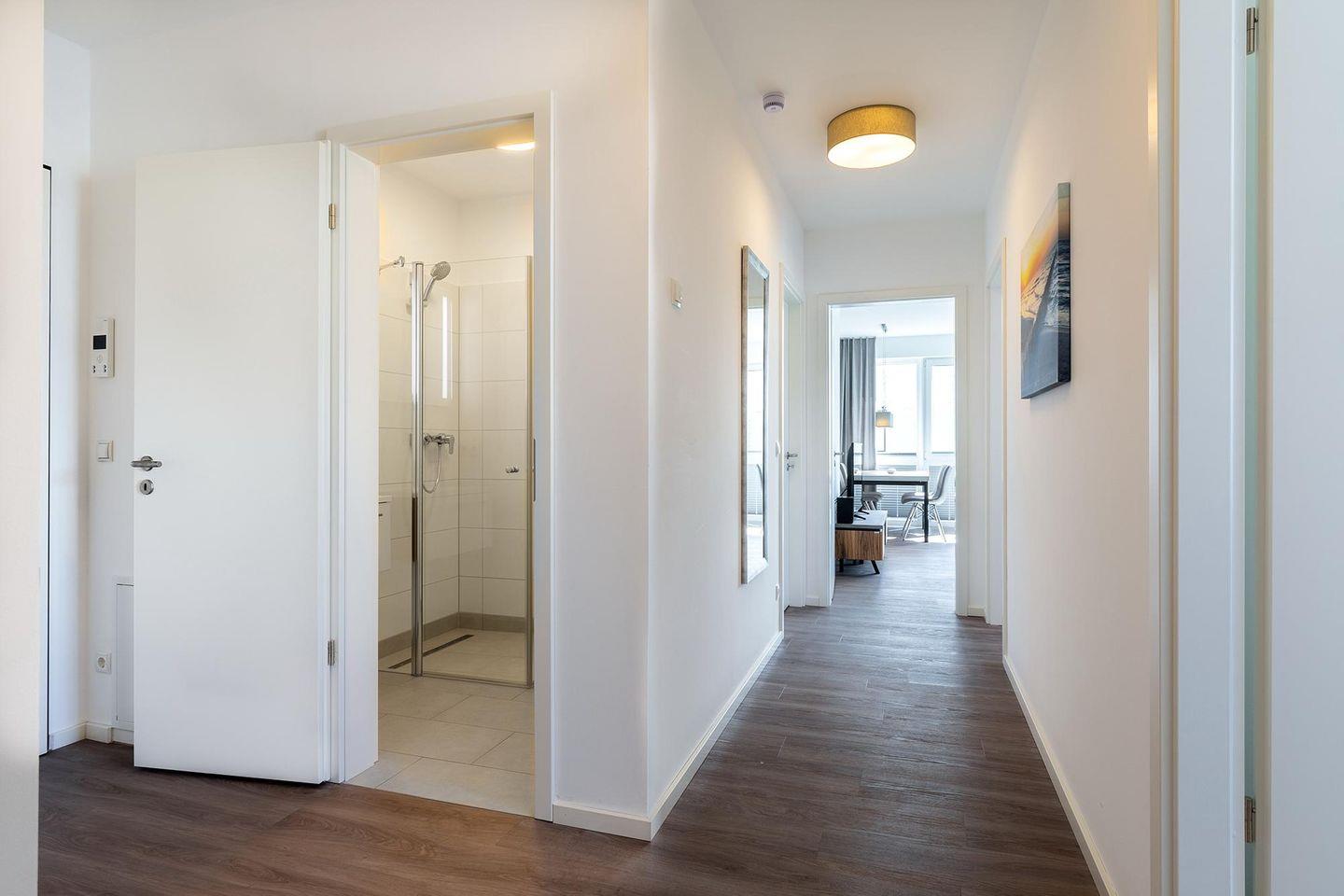 Das helle und moderne Nichtraucher-Apartment verfügt über Fußbodenheizung, bodentiefe Fenster mit 3-fach Isolierung, kostenfreies WLAN und eine voll ausgestattete offene Küche mit Geschirrspüler, Gefrierfach, Kaffeemaschine, Toaster, Wasserkocher, Backofen und Mikrowelle sowie über einen Essbereich. Im großzügig konzipierten Wohnbereich befindet sich eine Doppelschlafcouch (1,60 x 2,00 m) und ein großer Flatscreen-TV mit Blu-ray-Player. Beide separaten Schlafzimmer sind jeweils mit einem modernen Boxspringbett (1,80 x 2,00 m) Flatscreen-TV ausgestattet. Ein Kinderbett kann gegen Entgelt aufgestellt werden und auf Wunsch könnt ihr einen Kinderhochstuhl hinzubuchen. Die stilvollen Badezimmer verfügen jeweils über eine ebenerdige Dusche, WC, Waschtisch, Föhn, Kosmetikspiegel und Handtuchheizkörper. Das Apartment verfügt über einen großzügigen Flur mit Garderobe.