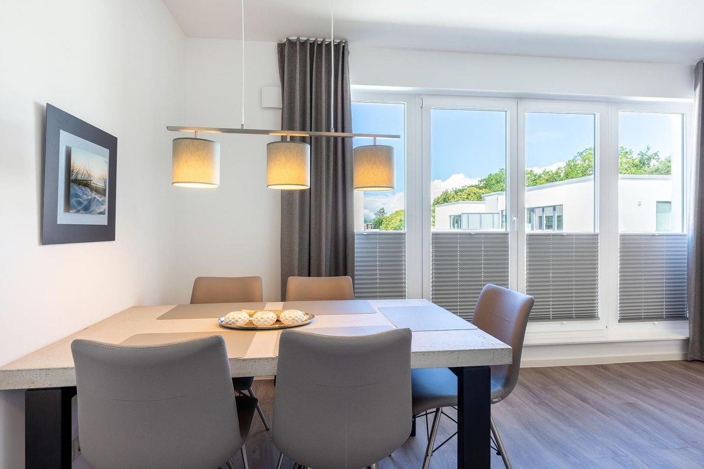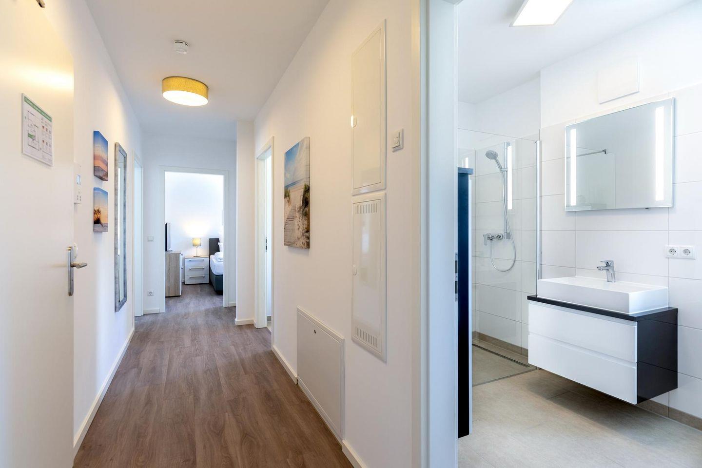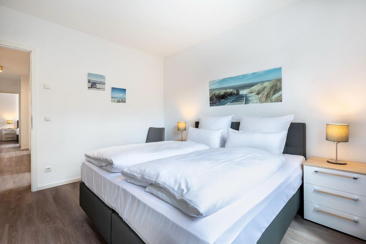 Das helle und moderne Nichtraucher-Apartment verfügt über Fußbodenheizung, bodentiefe Fenster mit 3-fach Isolierung, kostenfreies WLAN und eine voll ausgestattete offene Küche mit Geschirrspüler, Gefrierfach, Kaffeemaschine, Toaster, Wasserkocher, Backofen und Mikrowelle sowie über einen Essbereich. Im großzügigen Wohnbereich befindet sich eine Doppelschlafcouch (1,60 x 2,00 m) und ein großer Flatscreen-TV mit Blu-ray-Player. Beide separaten Schlafzimmer sind jeweils mit einem modernen Boxspringbett (1,80 x 2,00 m) und Flatscreen-TV ausgestattet. Ein Kinderbett kann gegen Entgelt aufgestellt werden und auf Wunsch könnt ihr einen Kinderhochstuhl hinzubuchen. Die beiden stilvollen Badezimmer verfügen jeweils über eine ebenerdige Dusche, WC, Waschtisch, Föhn, Kosmetikspiegel und Handtuchheizkörper. Das hochwertige Apartment verfügt über einen geräumigen Flur mit Garderobe.