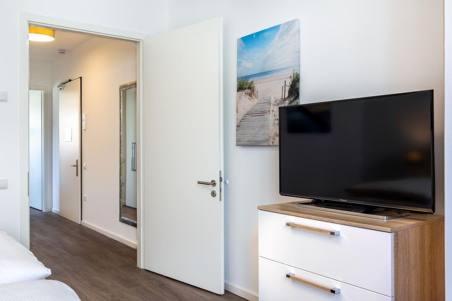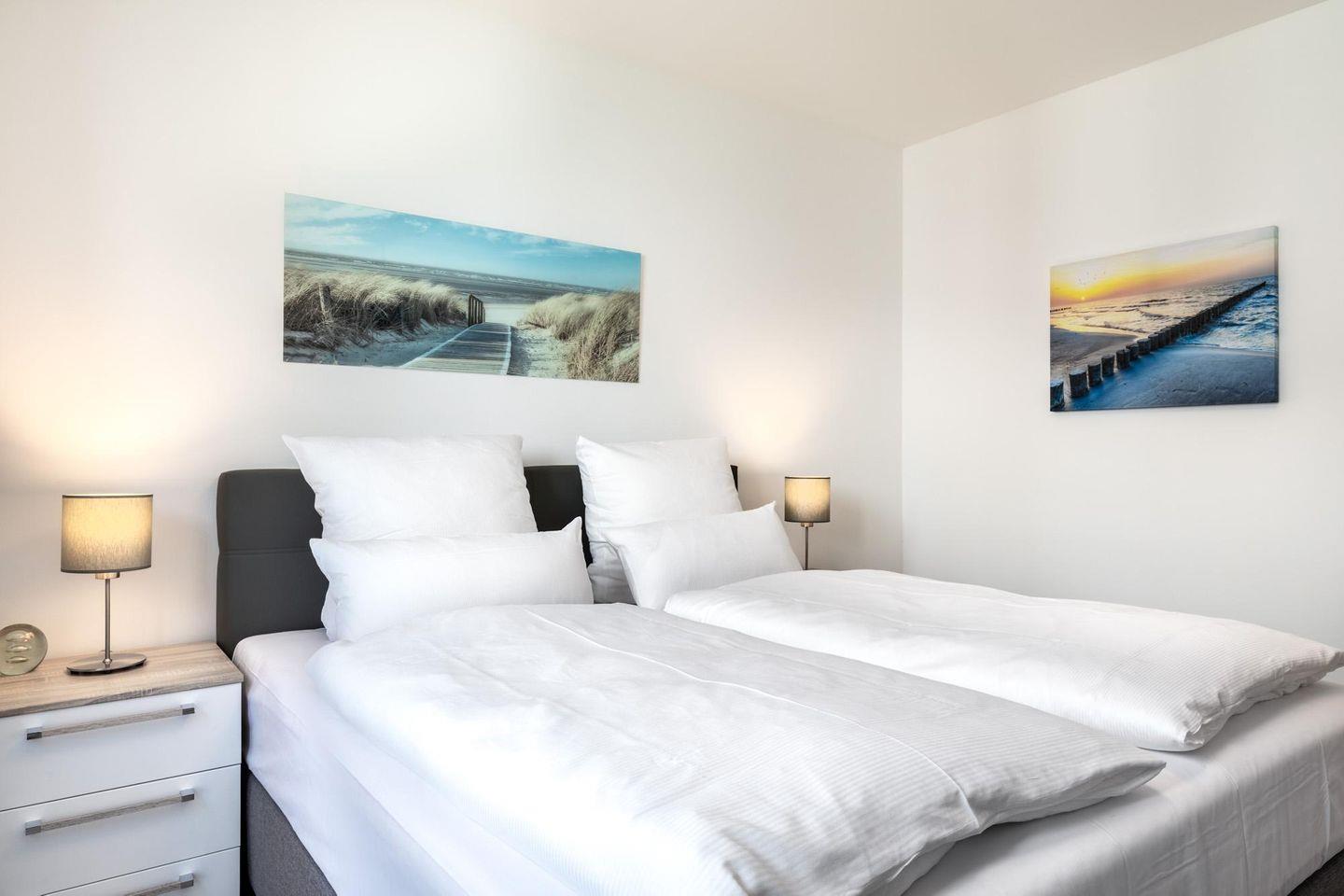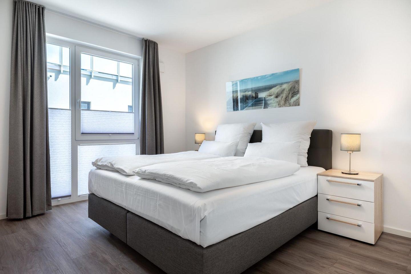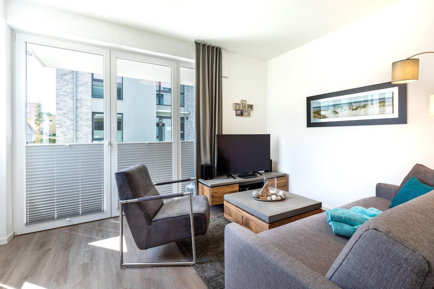 Das familienfreundliche und moderne Nichtraucher-Apartment verfügt über Fußbodenheizung, bodentiefe Fenster mit 3-fach Isolierung, kostenfreies WLAN und eine voll ausgestattete offene Küche mit Geschirrspüler, Gefrierfach, Kaffeemaschine, Toaster, Wasserkocher, Backofen und Mikrowelle sowie über einen Essbereich. Im Wohnbereich befindet sich eine Doppelschlafcouch (1,60 x 2,00 m) und ein großer Flatscreen-TV mit Blu-ray-Player. Das separate Schlafzimmer ist mit einem modernen Boxspringbett (1,80 x 2,00 m) und einem Flatscreen-TV ausgestattet. Im stilvollen Badezimmer befinden sich eine ebenerdige Dusche, ein Waschtisch mit Föhn, Kosmetikspiegel und Handtuchheizkörper. Das Apartment verfügt über einen Flur mit Garderobe. Nach einem erholsamen Urlaubstag lässt es sich auf der mit Gartenmöbeln und Sonnenschirm ausgestatteten und sonnigen Terrasse, herrlich entspannen. Die Terrasse ist vom Wohnzimmer aus begehbar.