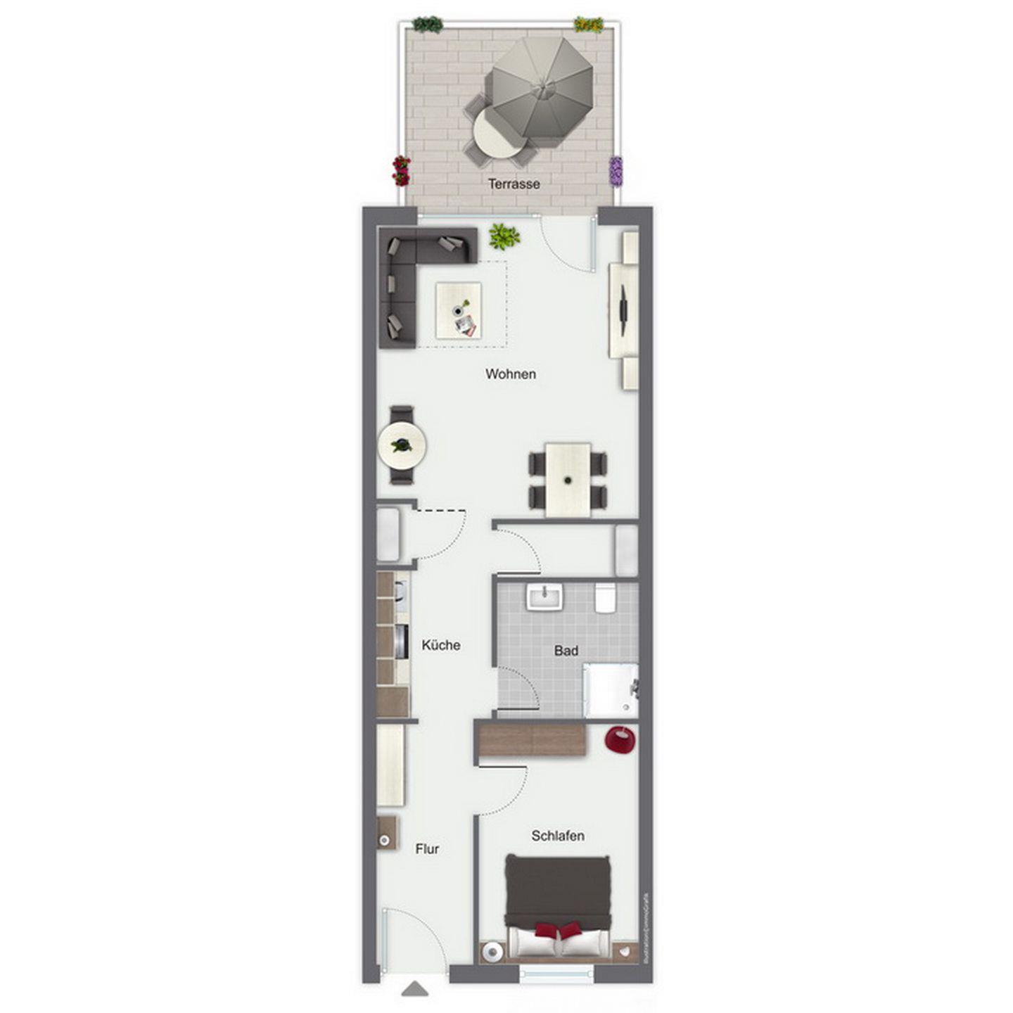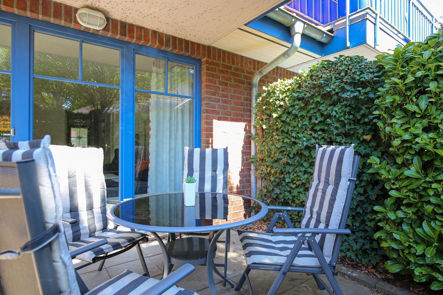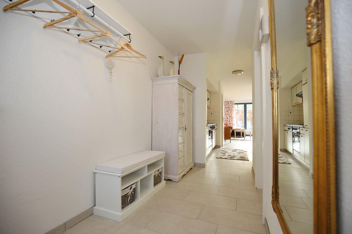Du bewohnst auf 55 qm² ein schönes 2-Zimmerappartment mit Terrasse in Süd-West Lage. Die Wohnung verfügt über einen Wohn- und Essbereich, eine Küchenzeile, ein Schlafzimmer und ein Duschbad. Die Entfernung zum Strand beträgt ca. 250 m.
