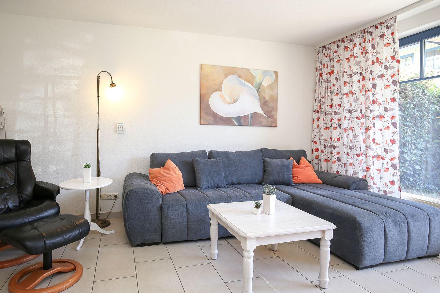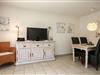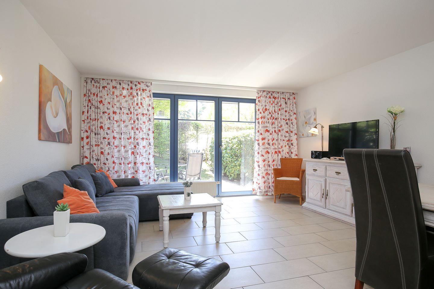 Die möblierte Terrasse betrittst du über das Wohnzimmer. Der Wohnraum bietet ein bequemes Schlafsofa (130 x 200 cm) und einen Esstisch für vier Personen. Für Abwechslung sorgen ein Flachbild-TV, eine Stereoanlage und eine Auswahl an Büchern. Der Boden ist im Wohn- und Eingangsbereich mit Designerfliese ausgelegt.