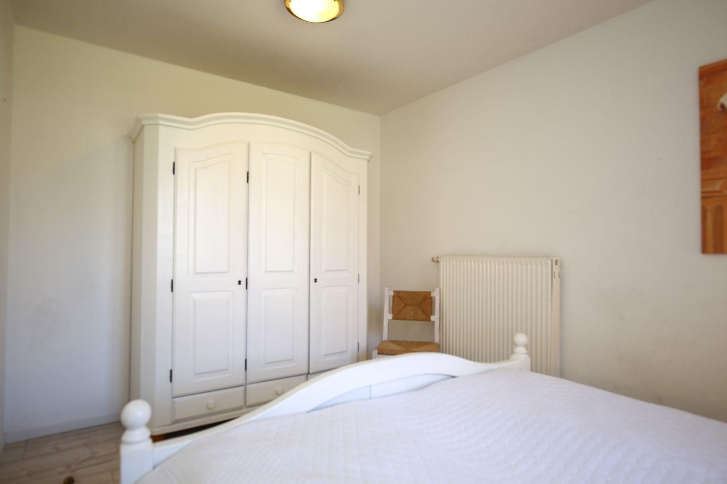 Es erwarten dich im Schlafzimmer ein Doppelbett (2 x 90 x 200 cm) und ein geräumiger Kleiderschrank. Die Fenster werden mit Vorhängen abgedunkelt. Als Bodenbelag wurde Laminat gewählt.