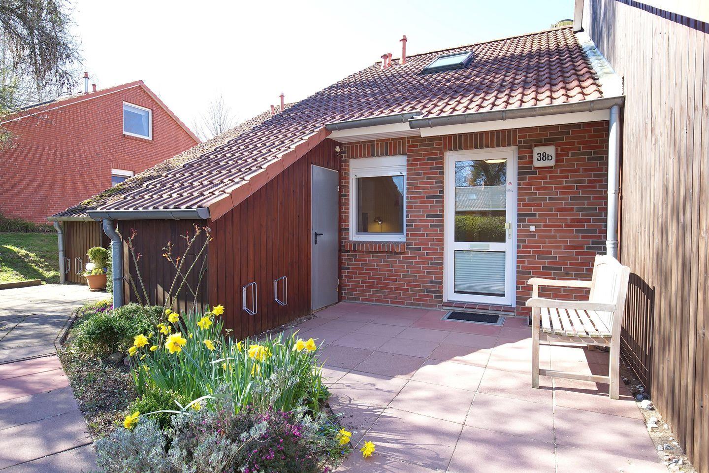 Am Rand des Urlauberdorfes liegt das Ferienhaus 38 b sehr ruhig und idyllisch - umgeben von Naturwiesen mit alten Bäumen (Landschaftsschutzgebiet). Das modern eingerichtete, ca. 54 m² große Ferienhaus verfügt auf zwei Ebenen über ein Wohnzimmer mit integrierter Küchenzeile, zwei Schlafzimmer, ein Duschbad sowie ein Gäste-WC. Die Terrasse ist süd-westlich ausgerichtet und selbstverständlich möbliert. Zum Strand sind es ca. 350 Meter.