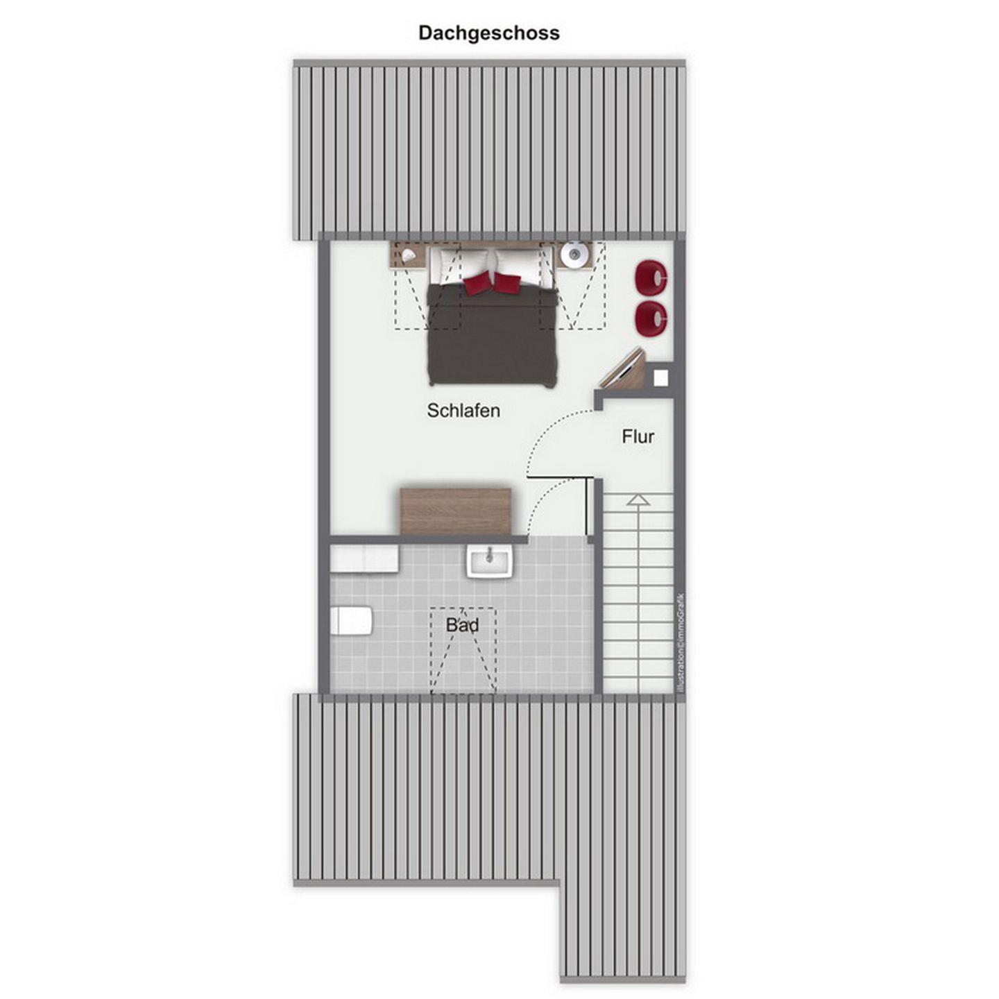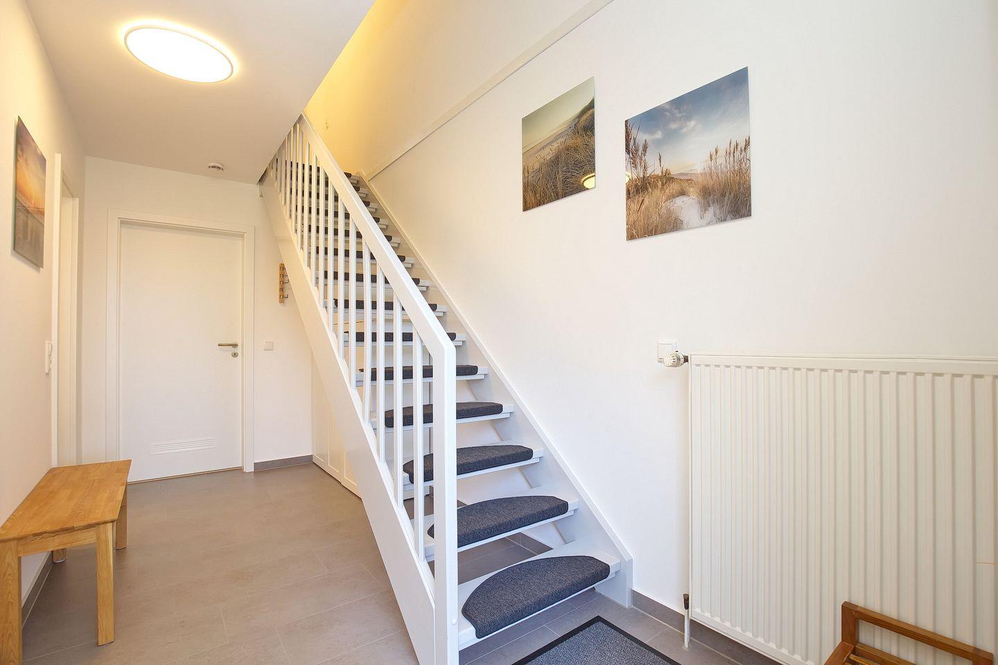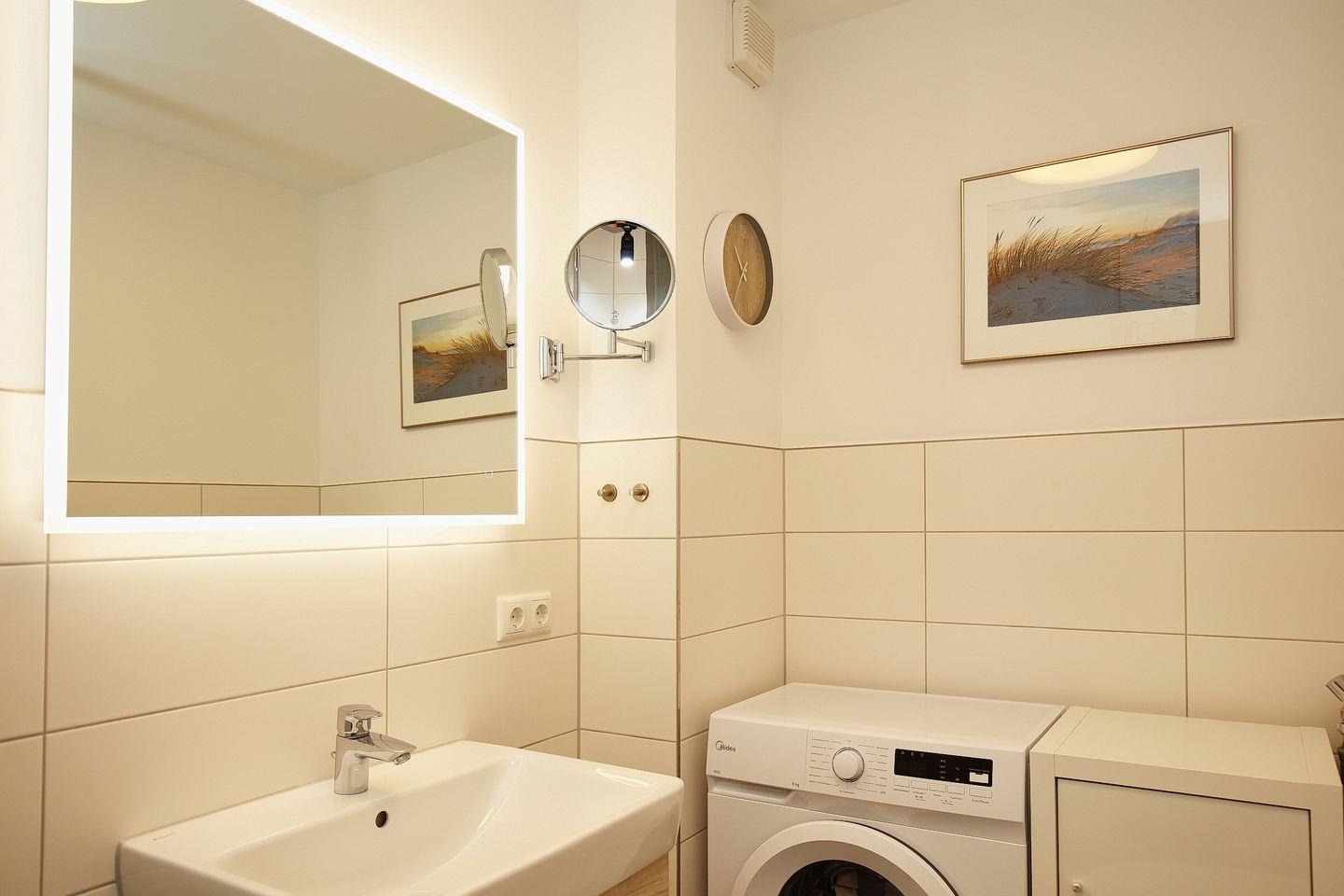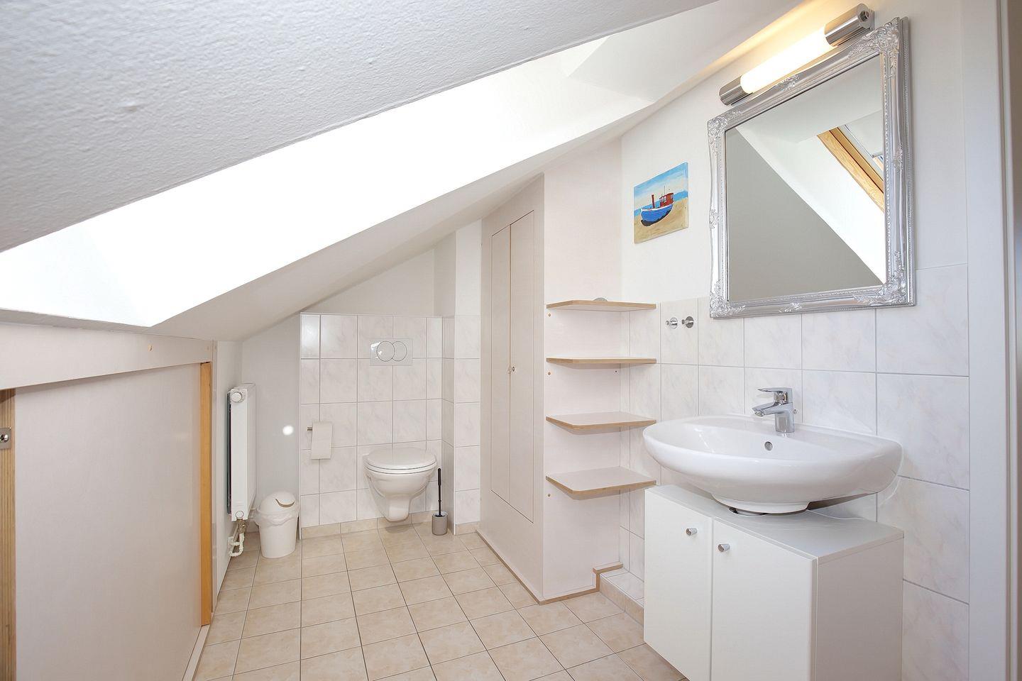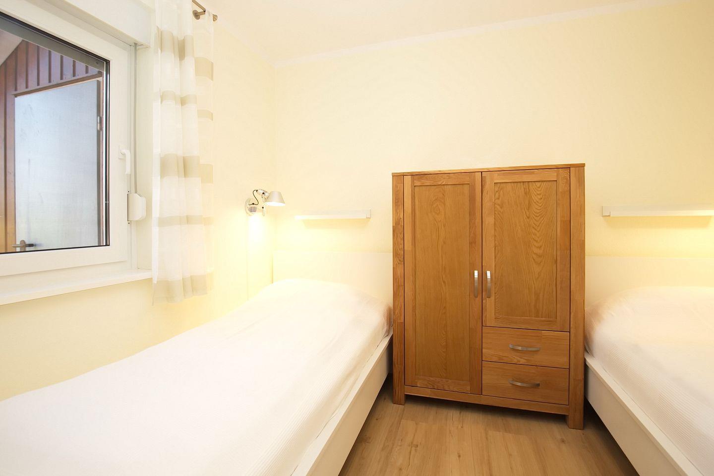Der Schlafraum im Erdgeschoss verfügt über zwei Einzelbetten (je 90 x 200 cm) und einen Schrank. Im Duschbad befindet sich eine Waschmaschine für die Wäsche zwischendurch. Alle Fenster im Erdgeschoss sind mit Rollläden ausgestattet.