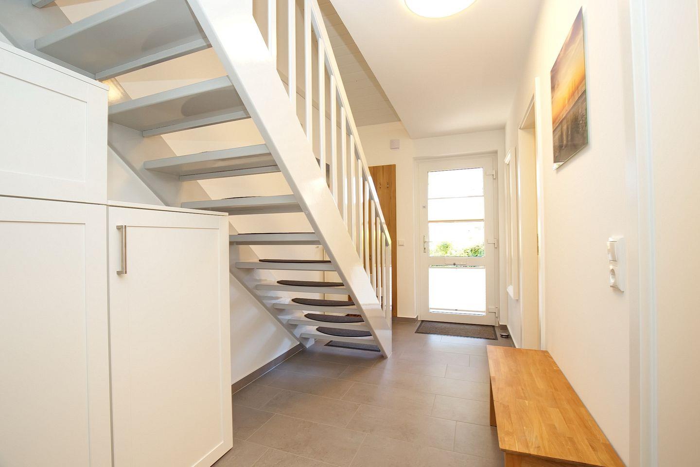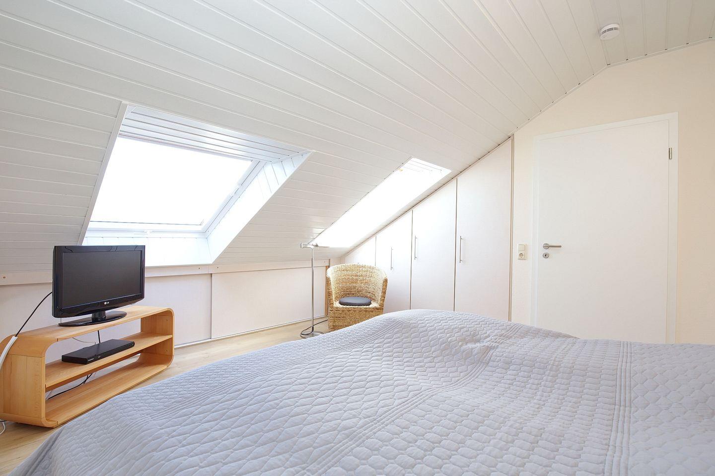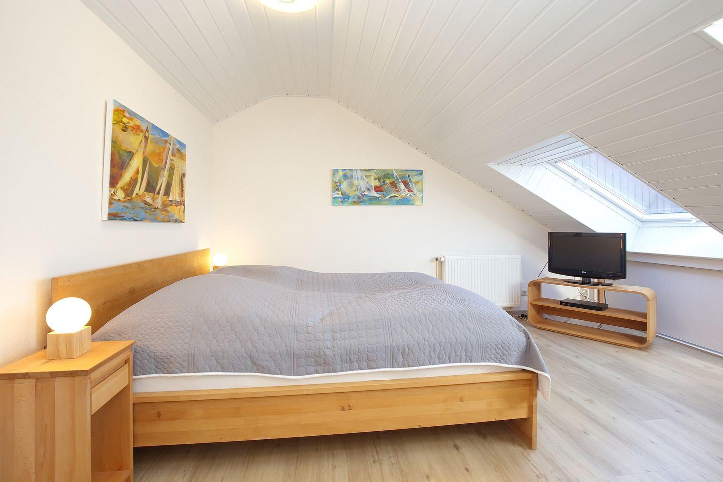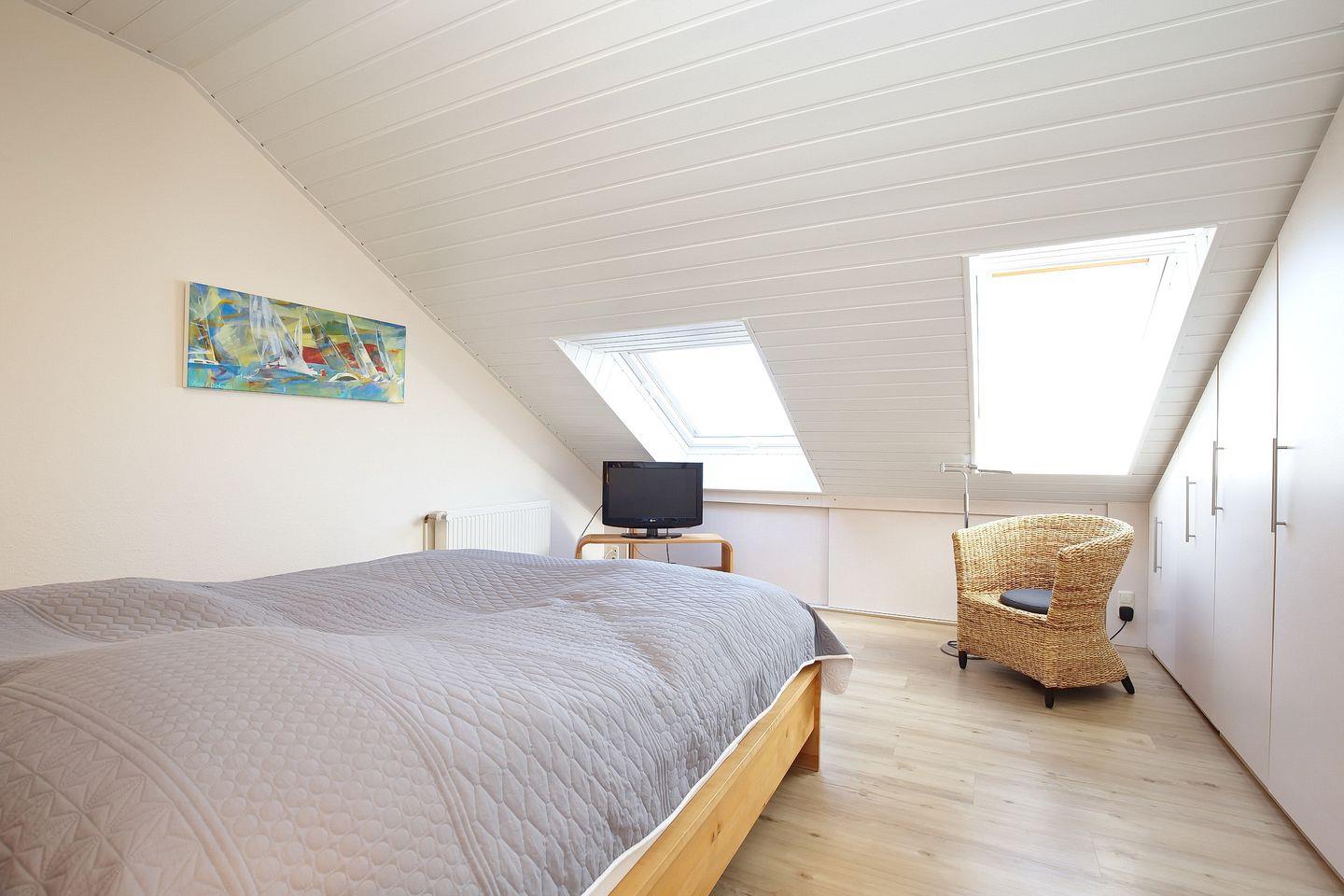 Eine Holztreppe führt in die ebenfalls helle, freundliche obere Etage des Ferienhauses. Das geräumige zweite Schlafzimmer mit breitem Doppelbett (180 x 200 cm) ist mit Vollholzmöbeln ausgestattet. Ein Kleinkinder-Bett sowie ein Kinderhochstuhl sind vorhanden. Hier verfügst du über ein Gäste-WC mit Waschbecken.