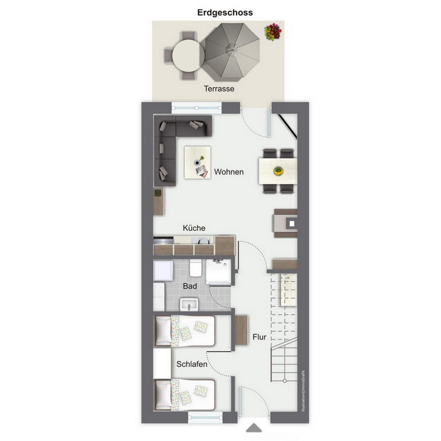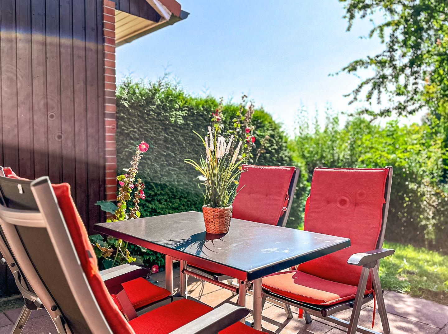 Vor dem Eingang befindet sich eine weitere Terrasse, deren dichte Bepflanzung ebenfalls eine Nutzung ermöglicht. Im Abstellraum neben dem Eingang können Grill, Fahrräder, Bollerwagen, etc. abgestellt werden.