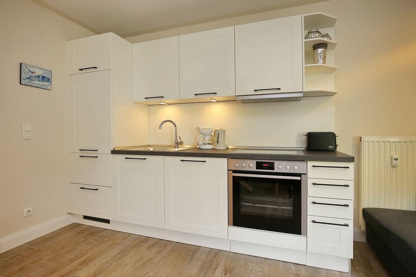 Die Küchenzeile verfügt u. a. über Kühlschrank mit Gefrierfach, Herd mit Backofen und einem 4-Platten-Cerankochfeld, und eine Mikrowelle. Der Esstisch im Küchenbereich bietet den idealen Platz für gemeinsame Mahlzeiten.
