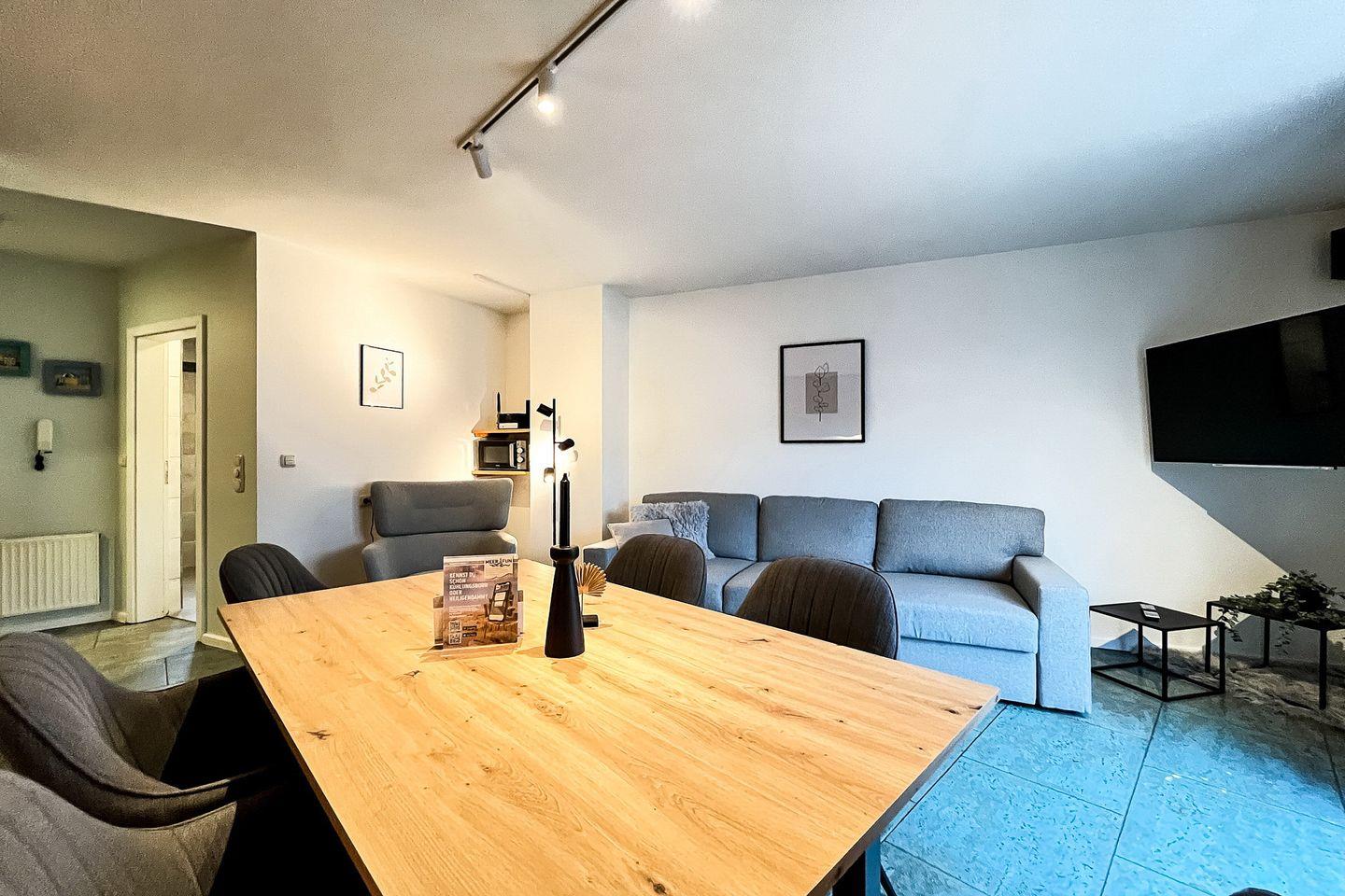 Über den Wohnbereich gelangst du auf den möblierten Balkon. Das Wohnzimmer schafft mit einem bequemen Schlafsofa (140 x 200 cm) und einem Esstisch für 6 Personen ein stilvolles Ambiente. Zum Zeitvertreib dienen ein Flachbild-TV und ein Radio.
