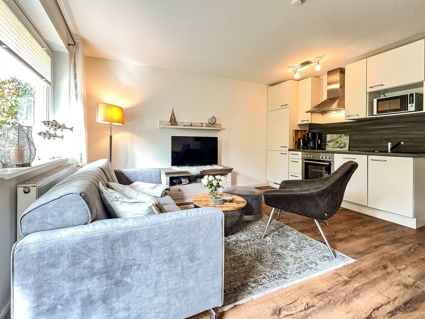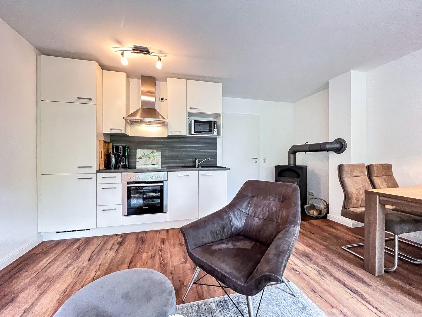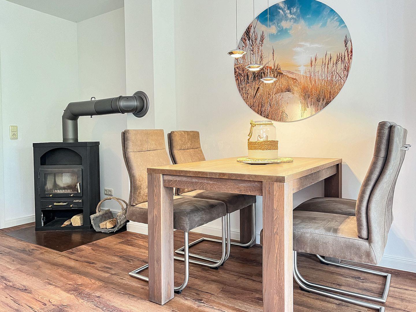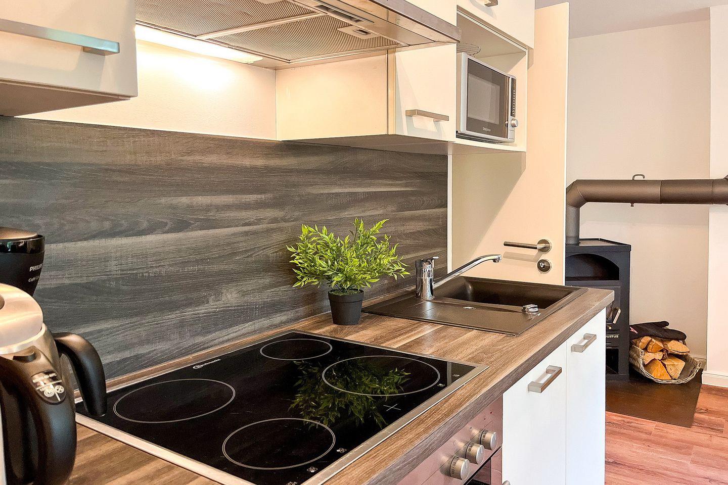 Die in den Wohnbereich integrierte Küchenzeile bietet dir neben einer vollständigen Ausstattung natürlich einen 4-Plattenherd mit Cerankochfeld, einen Backofen sowie einen Geschirrspüler. Ein gemütlicher Essplatz für die ganze Familie befindet sich ebenfalls im Wohnbereich in unmittelbarer Nähe der Küchenzeile. Für ein behagliches Ambiente sorgt der Kamin, welcher gerne genutzt werden darf.