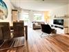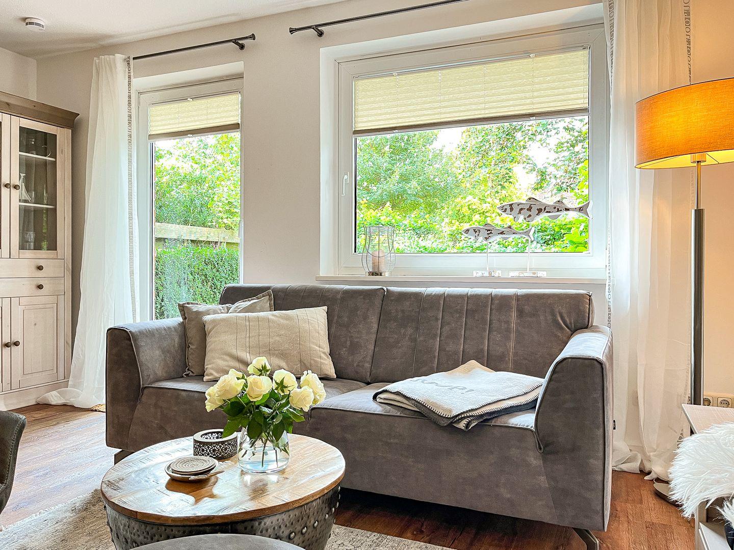 Vorhänge an den Fenstern dienen als Sicht- bzw. Sonnenschutz. Die Böden sind mit Design-Boden ausgelegt.