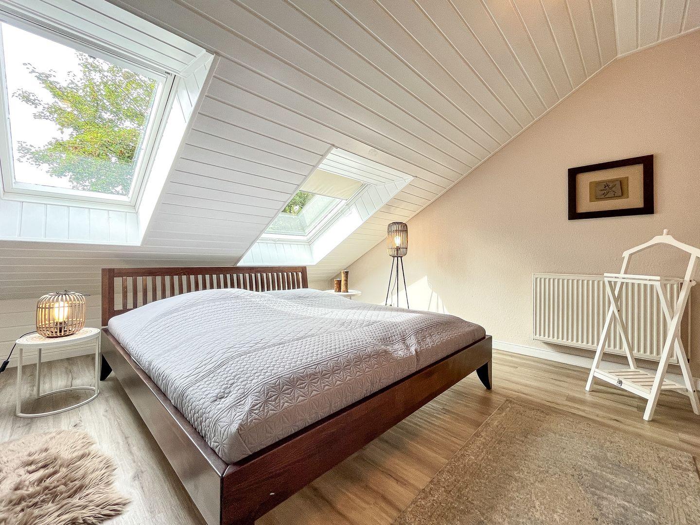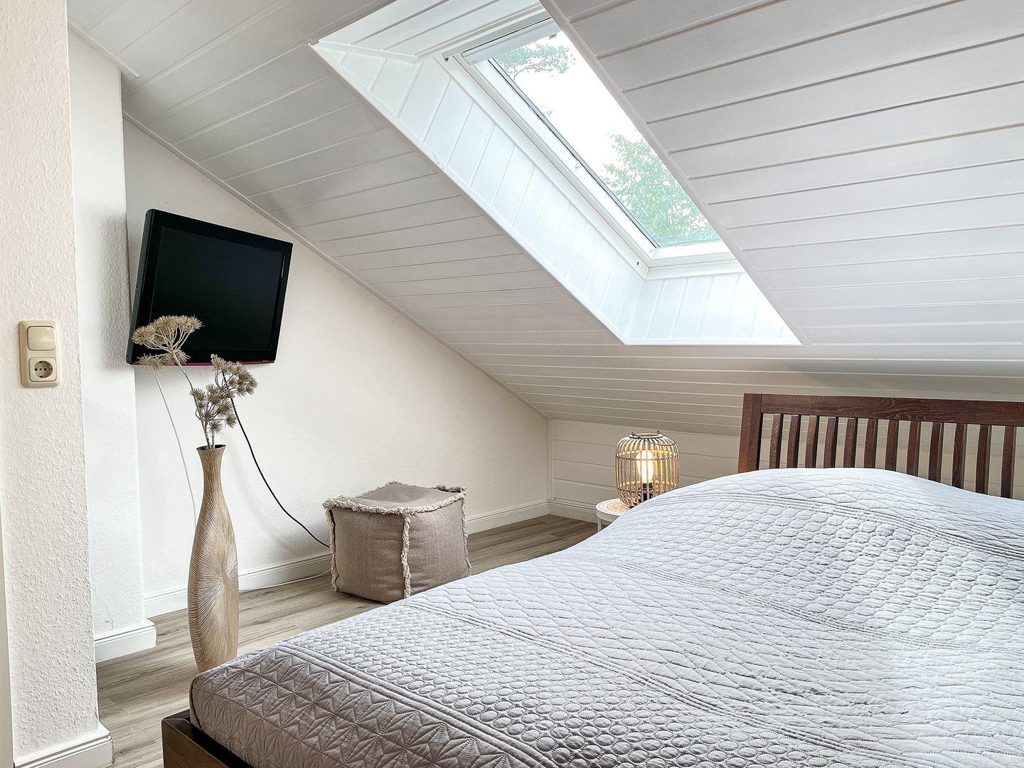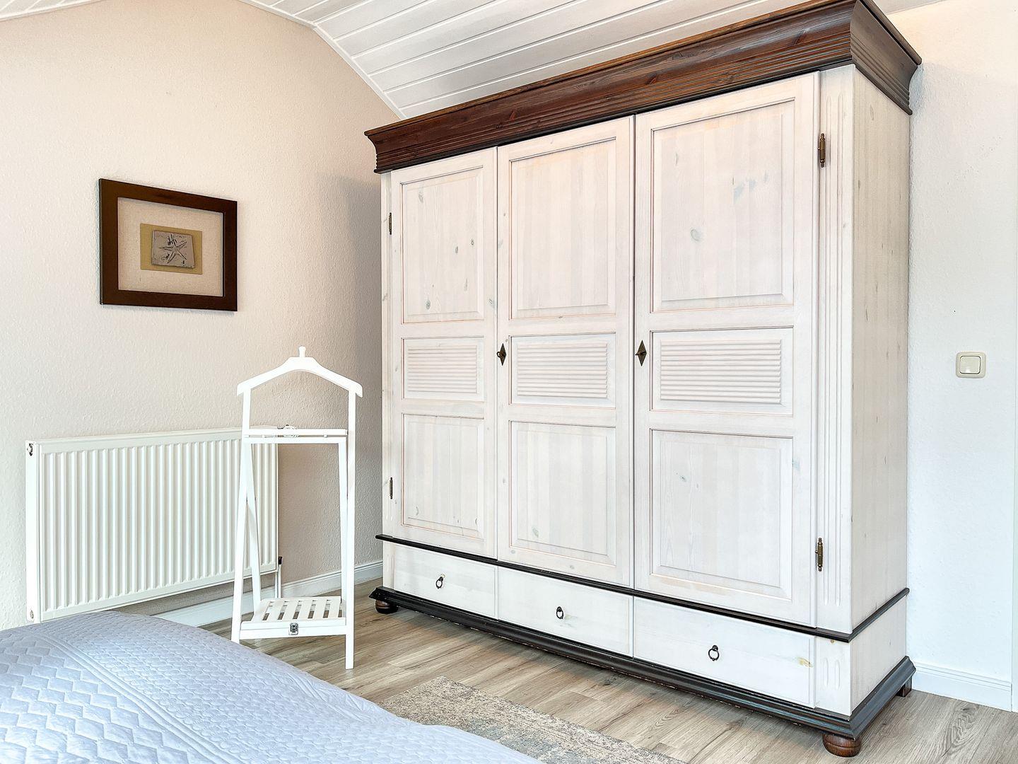 Als Schlafgelegenheiten stehen in dem Schlafzimmer im Obergeschoss 1 Doppelbett und in dem Schlafzimmer im Erdgeschoss 2 Einzelbetten zur Verfügung. Des Weiteren steht dir ein zweiter Fernseher im oberen Schlafzimmer zur Verfügung. Deine Garderobe kannst du in den Kleiderschränken verstauen.