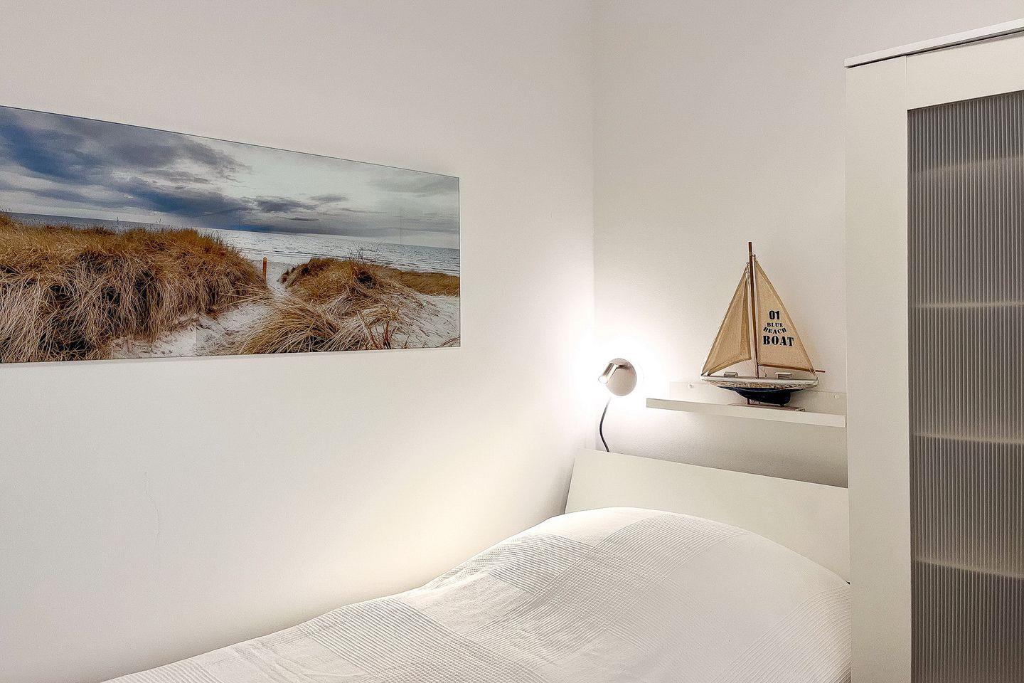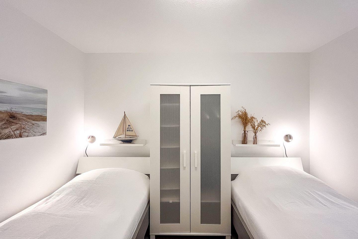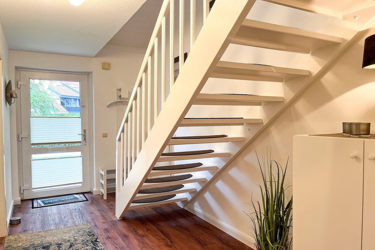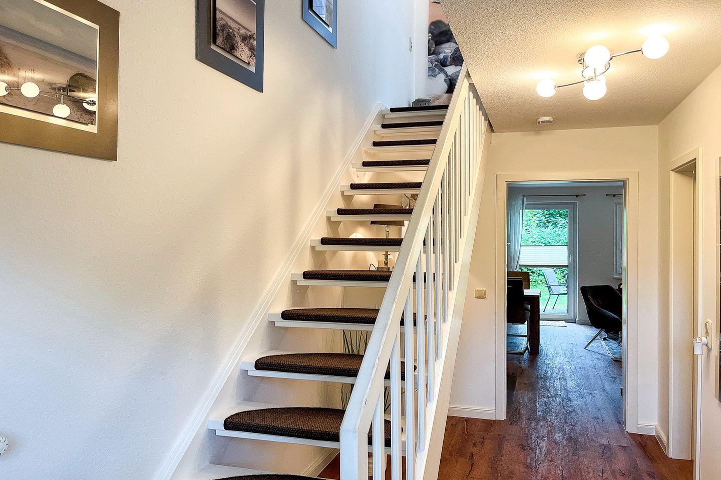 Als Schlafgelegenheiten stehen in dem Schlafzimmer im Obergeschoss 1 Doppelbett und in dem Schlafzimmer im Erdgeschoss 2 Einzelbetten zur Verfügung. Des Weiteren steht dir ein zweiter Fernseher im oberen Schlafzimmer zur Verfügung. Deine Garderobe kannst du in den Kleiderschränken verstauen.