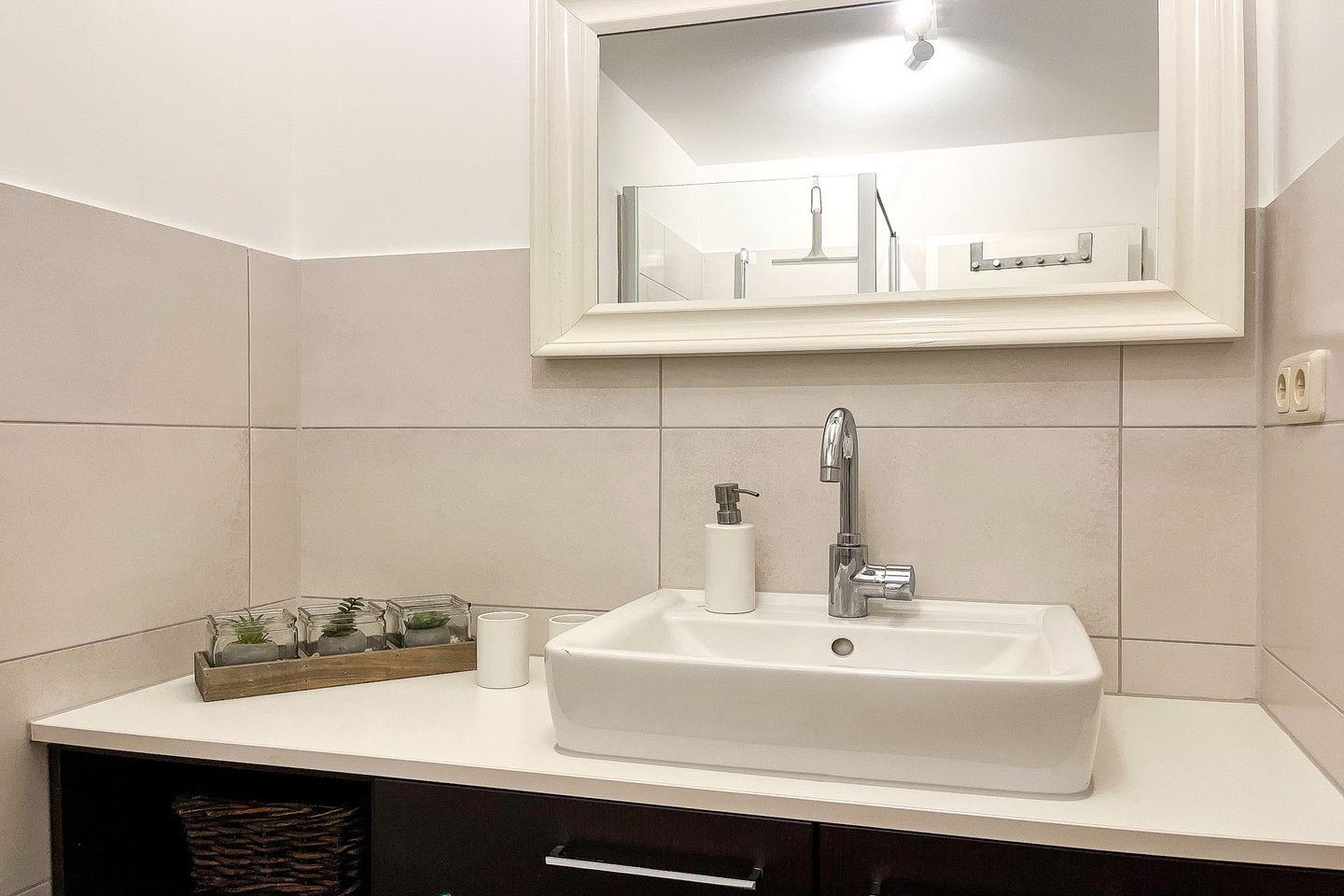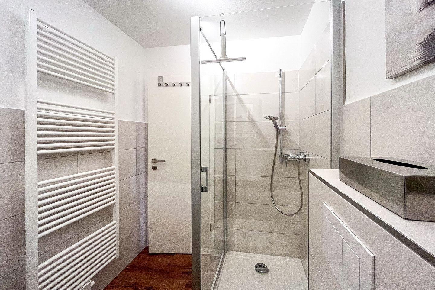 Das Ferienhaus verfügt über ein Duschbad mit ebenerdiger Dusche, in dem du auch einen Föhn finden kannst.