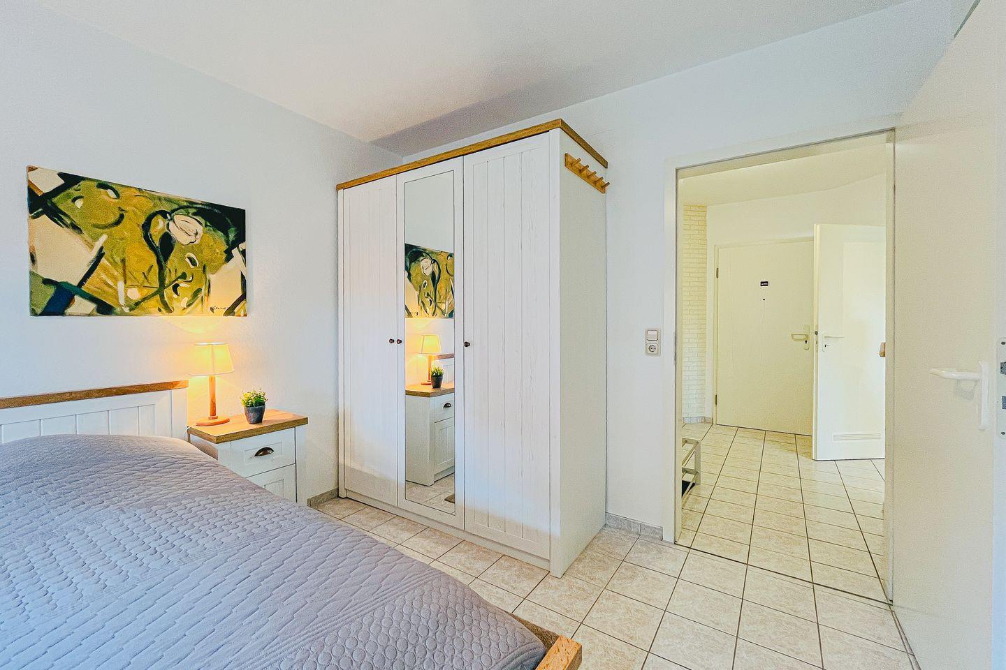 Im Schlafzimmer sind ein Doppelbett (2 x 90 x 200 cm) sowie ein großzügiger Kleiderschrank vorhanden. Die Fenster kannst du wie im Wohnzimmer mit Plissees und Vorhängen verdunkeln. Deine Koffer kannst du bequem im geräumigen Abstellraum verstauen.