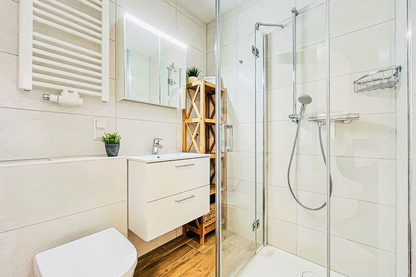 Das neue Duschbad ist gefliest und bietet diverse Möglichkeiten zur Ablage oder zum Aufhängen von Handtüchern. Ein Föhn ist vorhanden.