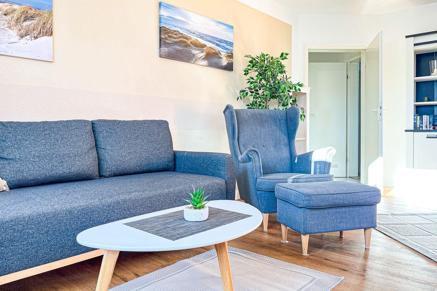Im Wohnbereich findest du neben dem Esstisch mit 4 Stühlen die mit wenigen Handgriffen zu einem Doppelbett ausklappbare Couch (Liegefläche 144 cm x 199 cm) und eine gemütliche Leseecke. Für deine Unterhaltung gibt es neben Radio/CD einen Flachbildfernseher mit DVD-Ray-Player sowie eine kleine Auswahl an Büchern. WLAN steht dir kostenlos zur Verfügung (ohne Gewähr). Als Sichtschutz dienen Plissees, die zur Verdunklung durch Vorhänge ergänzt werden. Die Böden sind pflegeleicht gefliest oder mit Vinyl ausgelegt, daher sind in dieser Nichtraucherwohnung Haustiere erlaubt.