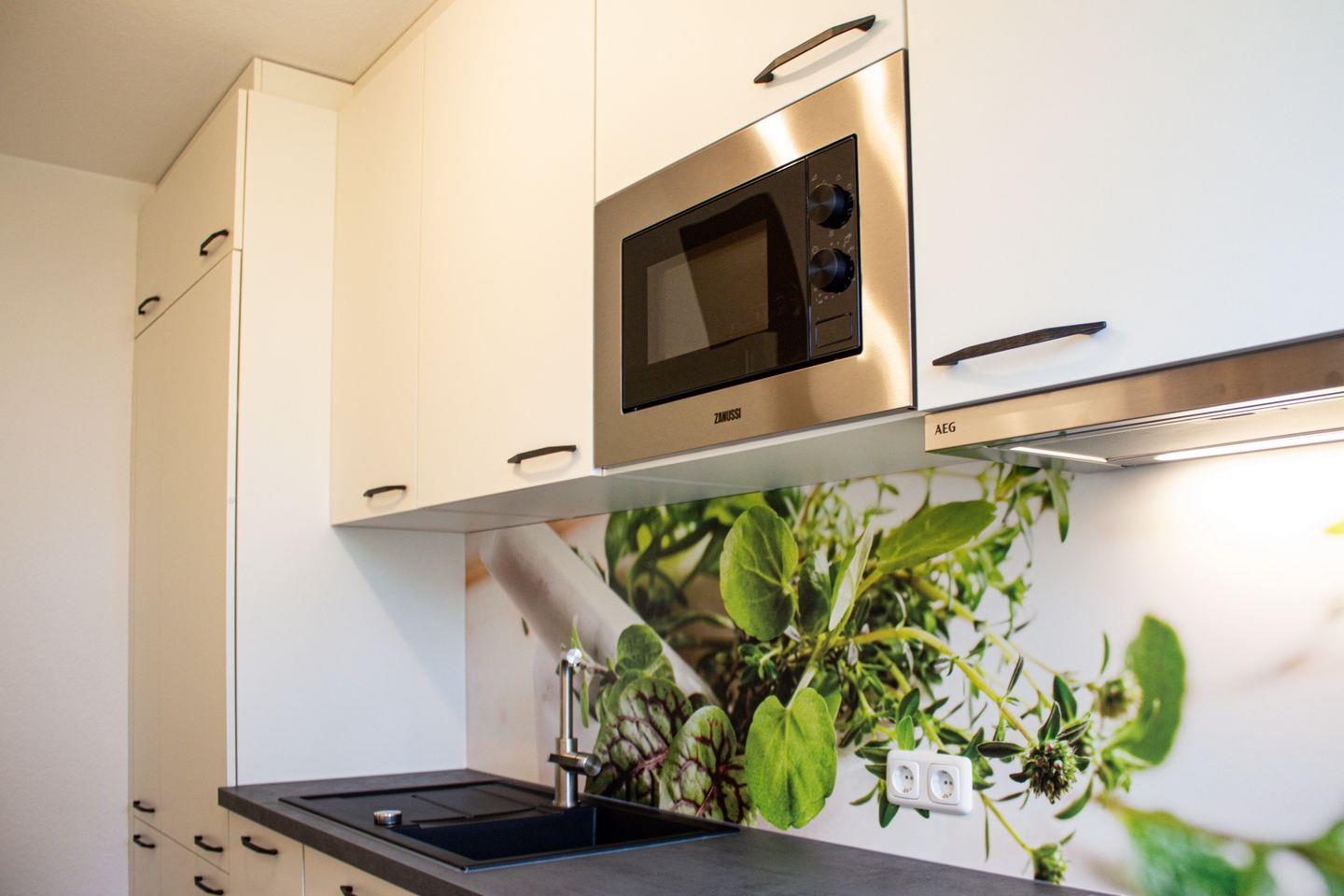Die Küche ist separat gelegen und u.a. mit Cerankochfeld, Geschirrspüler, Backofen, Mikrowelle, Kühlschrank mit Gefrierfach, ausreichend Besteck und Geschirr ausgestattet. Für die kleinen Gäste steht ein Hochstuhl zur Verfügung.