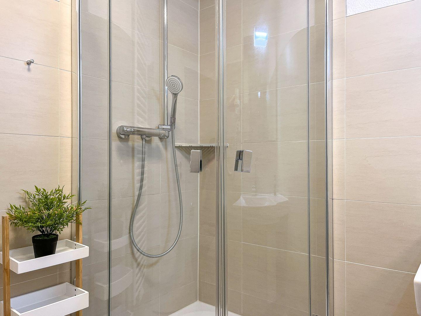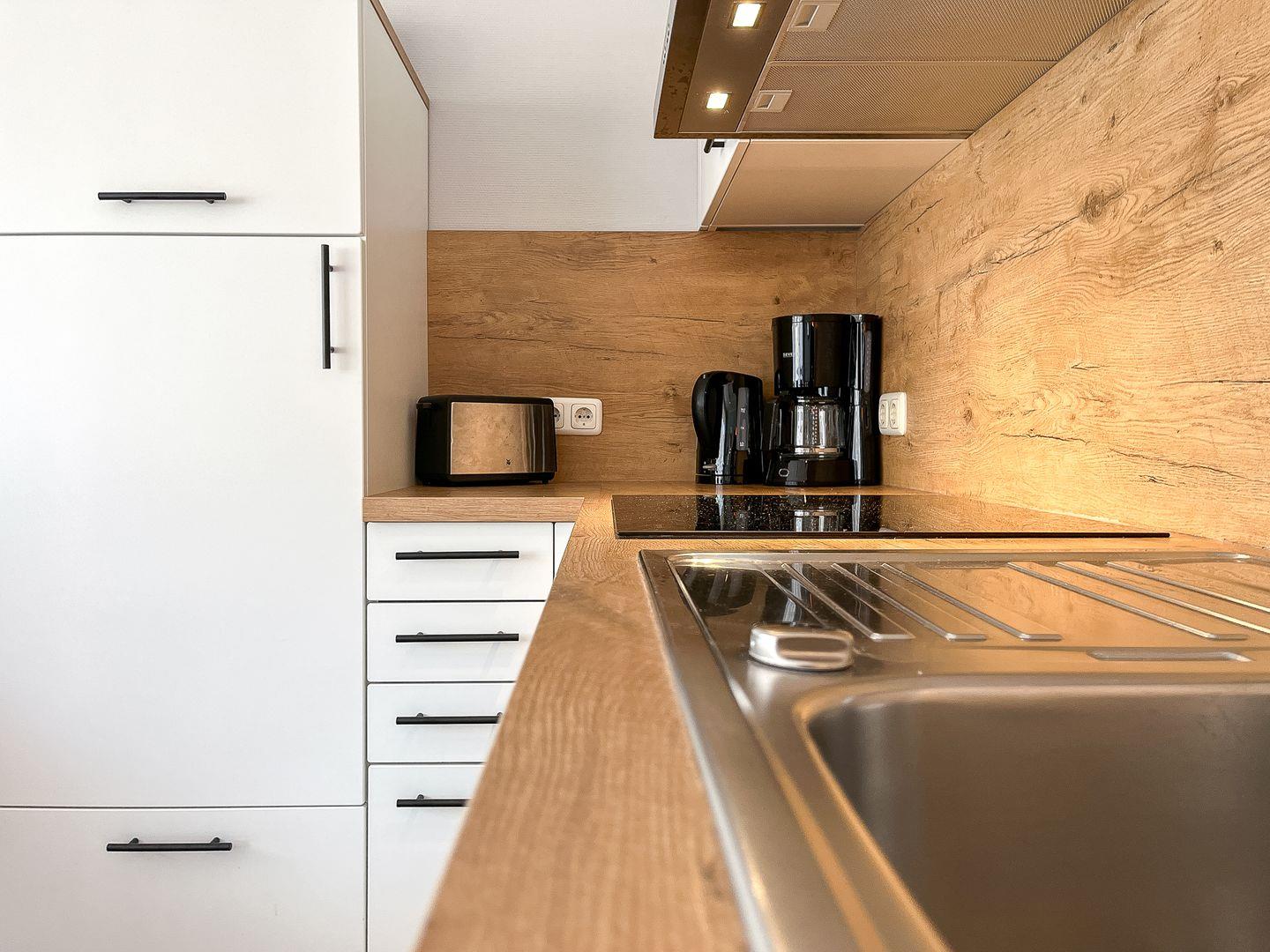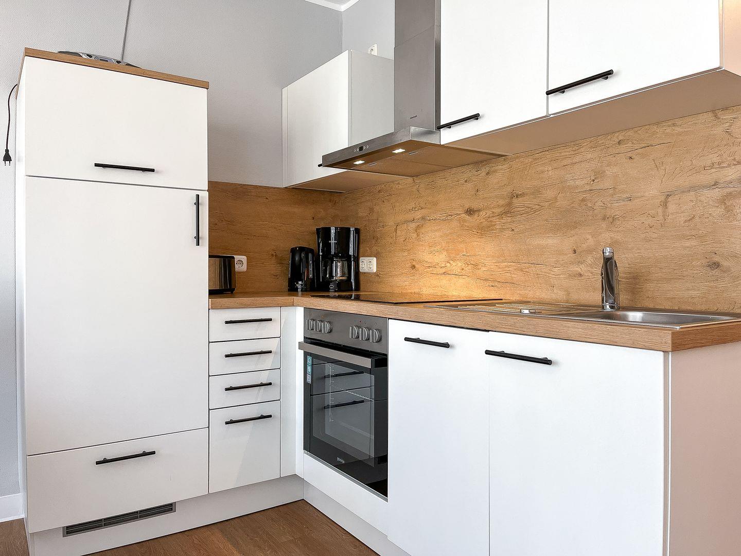 Die erneuerte Einbauküche ist unter anderem mit einem 4-Platten-Cerankochfeld, Backofen, Kühlschrank mit Tiefkühlfach, Mikrowelle und Geschirrspülmaschine ausgestattet. Ein gemütlicher Essplatz ist im Wohnbereich integriert. Ein gefliestes Duschbad ist vorhanden.