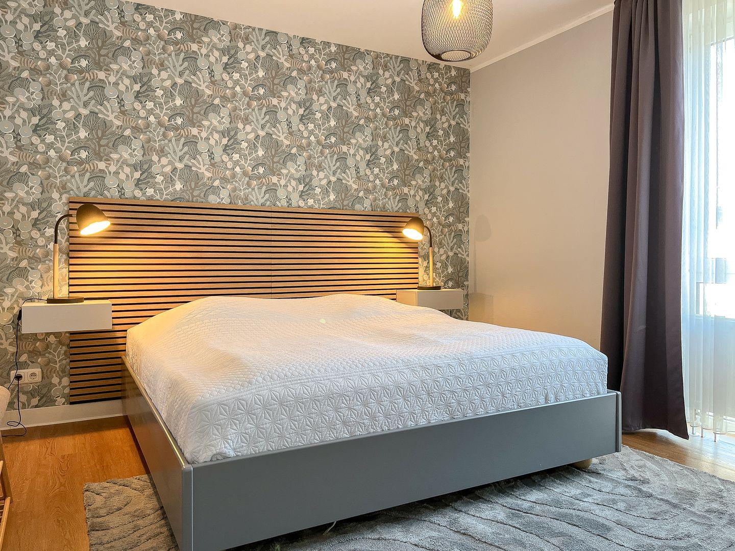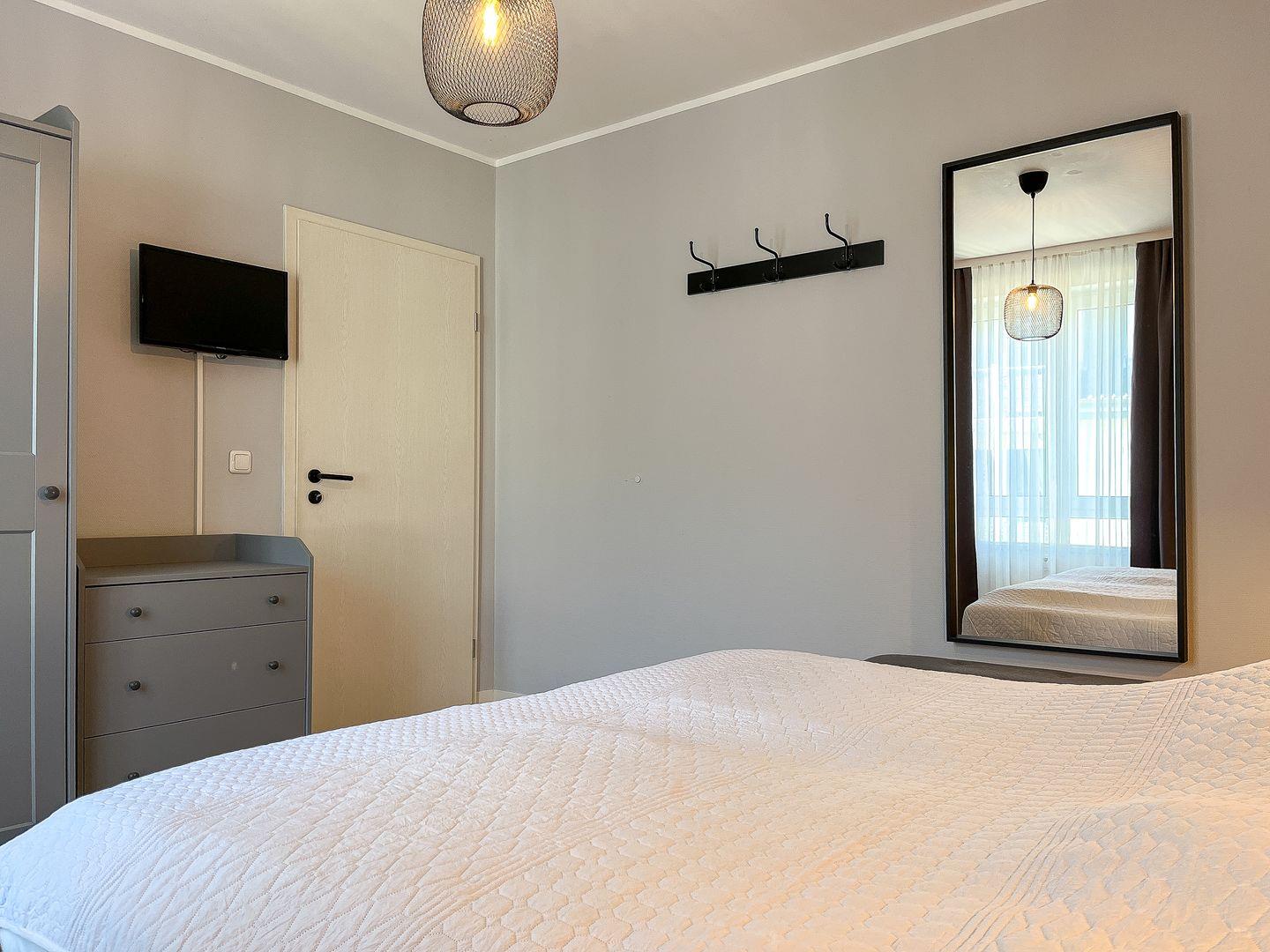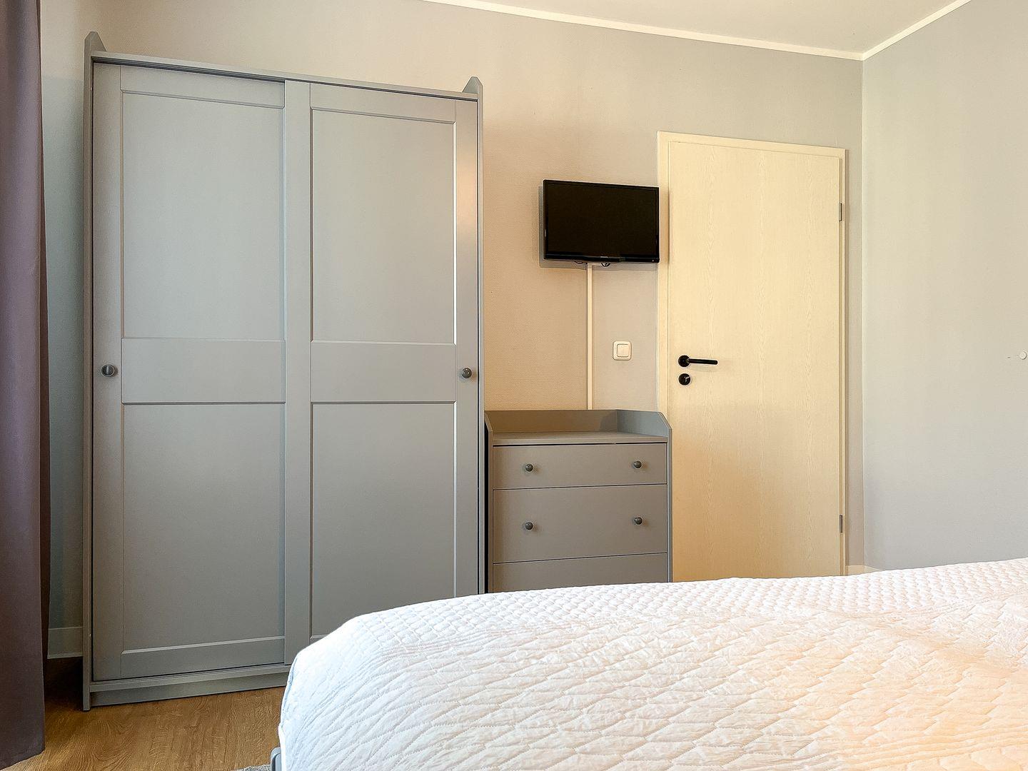 Dein Schlafzimmer verfügt über ein großes, komfortables Doppelbett (2 x 90 x 200 cm) und einen großen 3-türigen Kleiderschrank. Der Boden der Ferienwohnung ist mit hochwertigem Laminat ausgelegt. An den Fenstern befinden sich Verdunklungsgardinen. Hier steht dir auch ein 2. TV zur Verfügung.