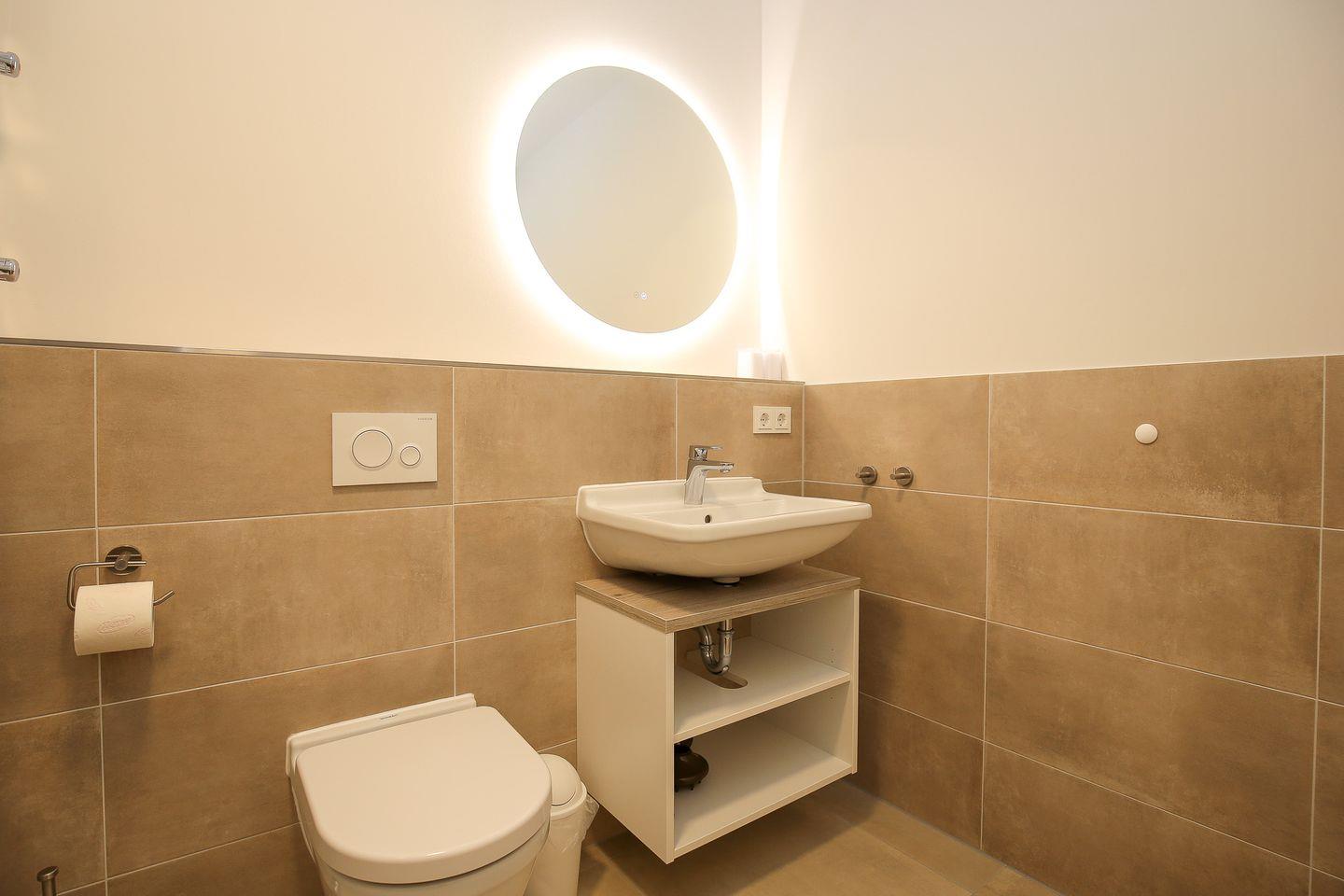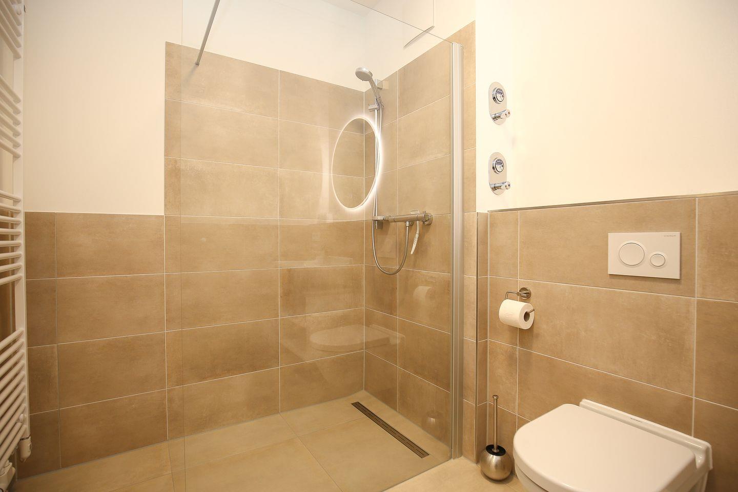 Das stilvolle Bad ist modern gefliest und mit einer bodengleichen Dusche, einem Waschtisch, einem WC sowie einem Handtuchheizkörper ausgestattet.