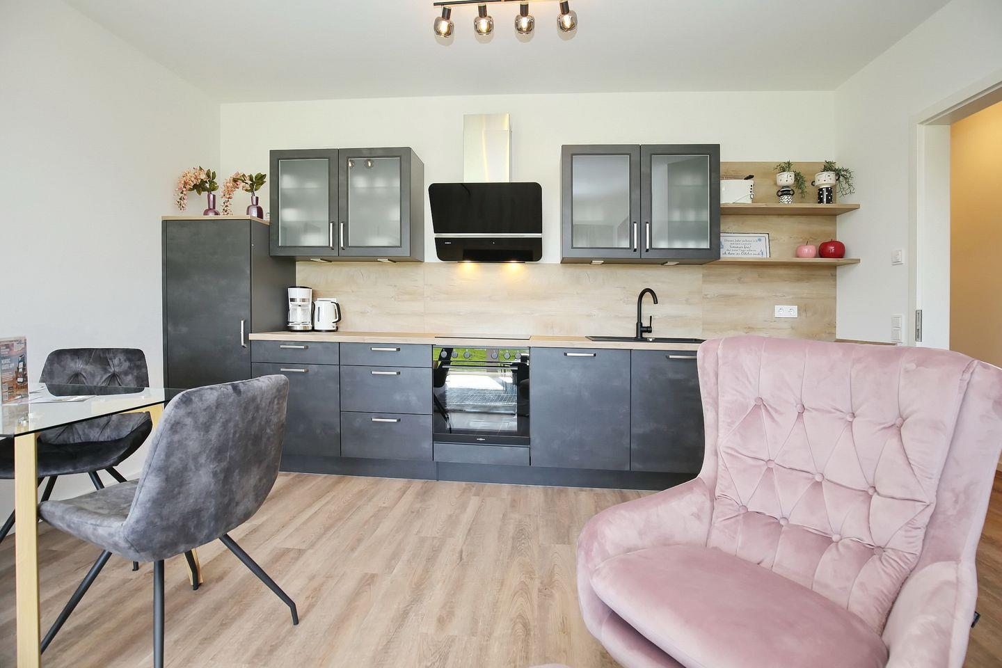 Die im Wohnzimmer integrierte Küche lässt keine Wünsche offen. Es ist alles vorhanden, was du zur Zubereitung der Mahlzeiten benötigst. Dazu zählen ein Herd mit einem 4-Platten-Cerankochfeld sowie einem Backofen, ein Kühlschrank mit Gefrierfach, eine Geschirrspülmaschine sowie ausreichend Geschirr, Besteck und Gläser.