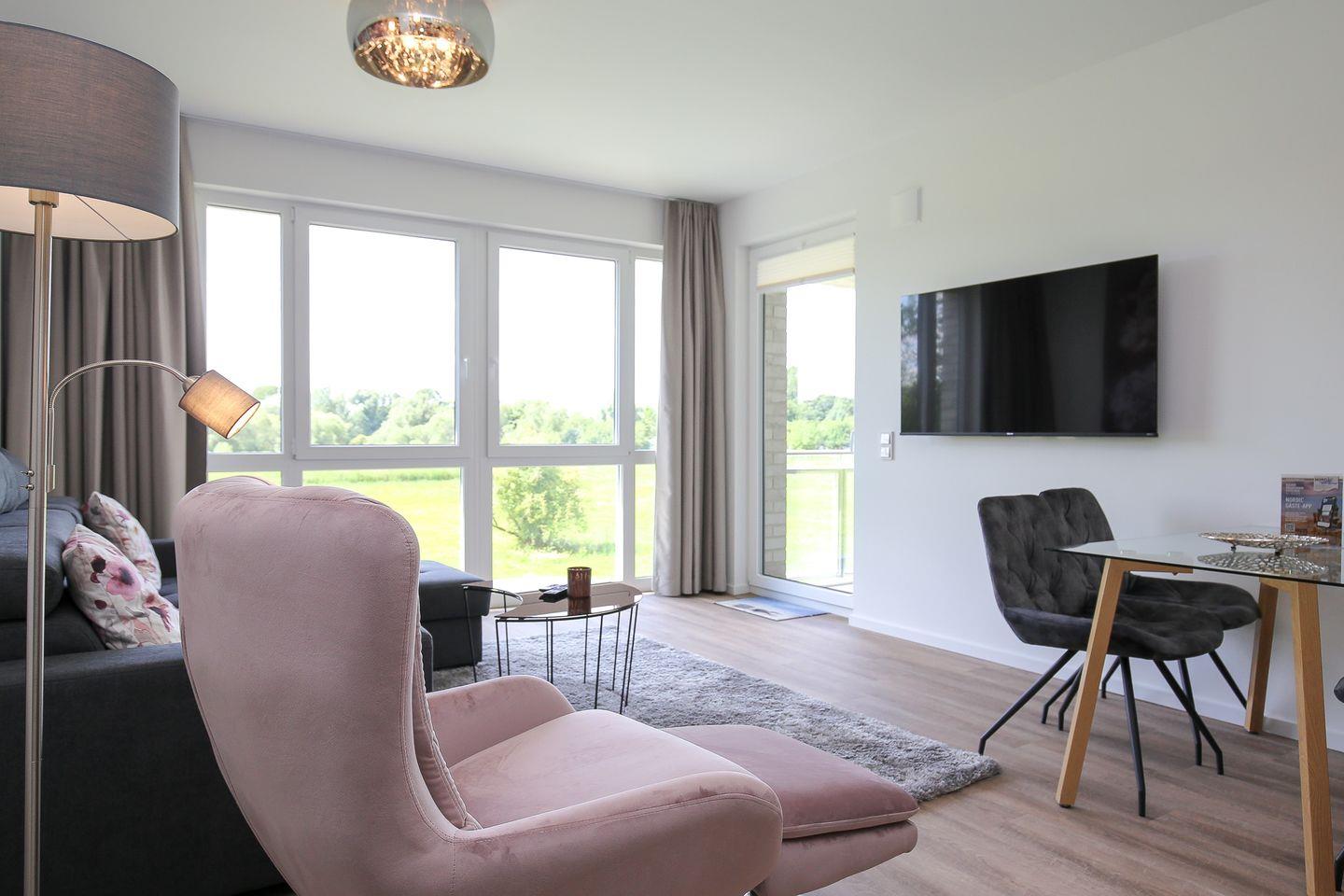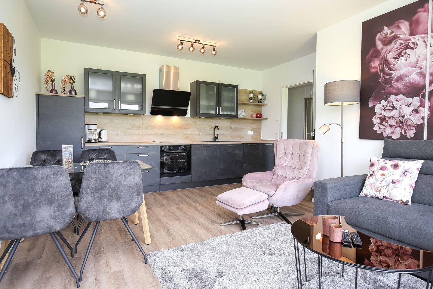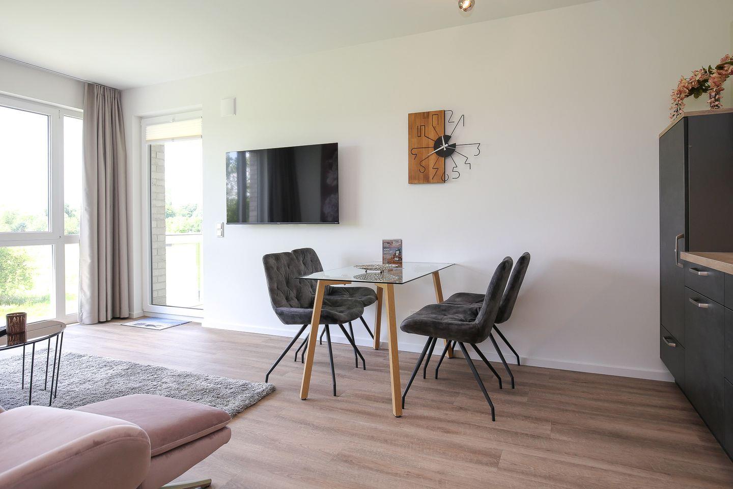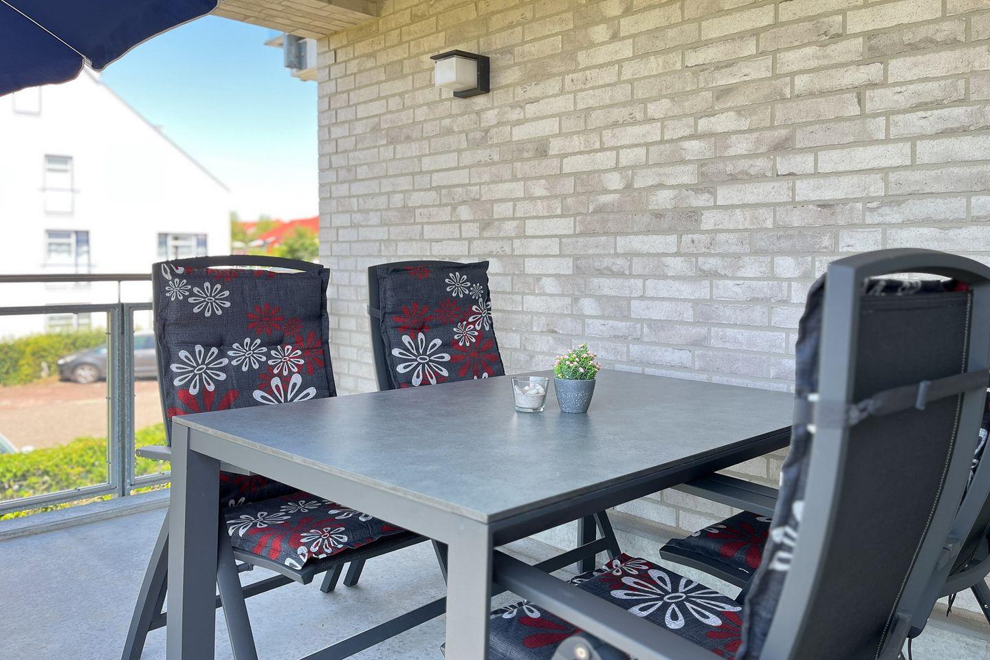 Deine ca. 61 m² große Ferienwohnung ist modern eingerichtet. Du verfügst über ein Wohnzimmer, eine im Wohnbereich integrierte Küche, ein Schlafzimmer, ein Badezimmer sowie einen Balkon. In der gesamten Wohnung ist ein Vinylbelag ausgelegt. Das Badezimmer ist gefliest. Die Strandentfernung beträgt ca. 200 Meter. Die Wohnung verfügt über breite Türen und ist somit für Rollstuhlfahrer geeignet. (Achtung: zum Balkon ist eine Stufe!)