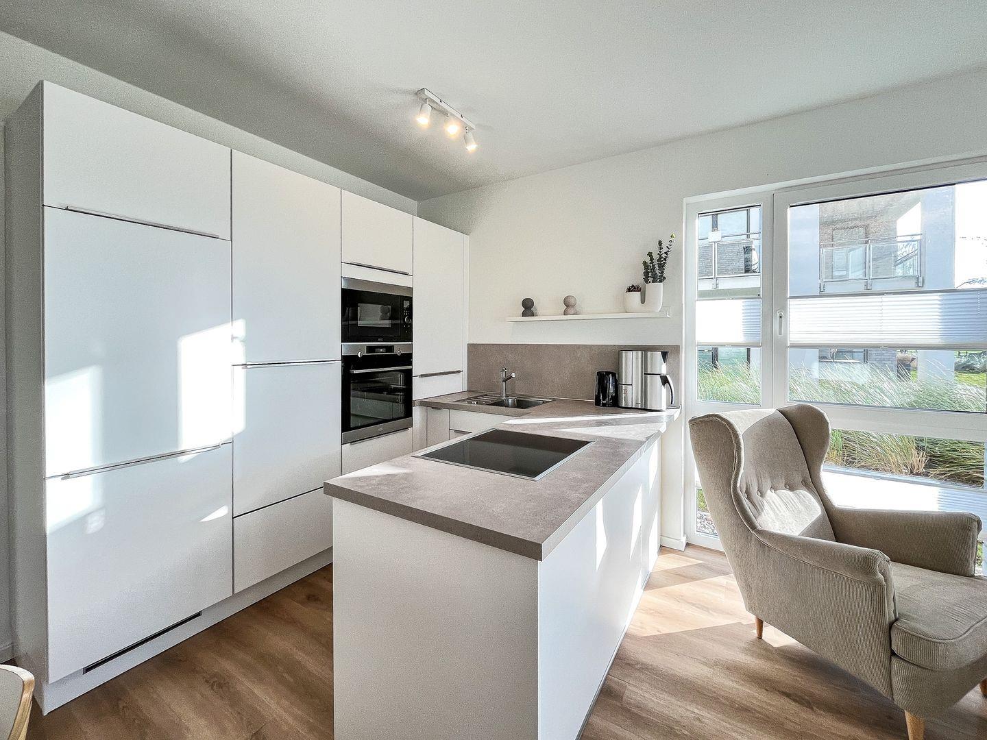 In der im Wohnzimmer integrierten Küche ist alles vorhanden, was du zur Zubereitung der Mahlzeiten benötigst. Dazu zählen ein Induktionsherd mit 4 Kochfeldern sowie ein Backofen, ein Kühlschrank mit 2 großen Gefrierfächern, eine Geschirrspülmaschine sowie ausreichend Geschirr, Besteck und Gläser.