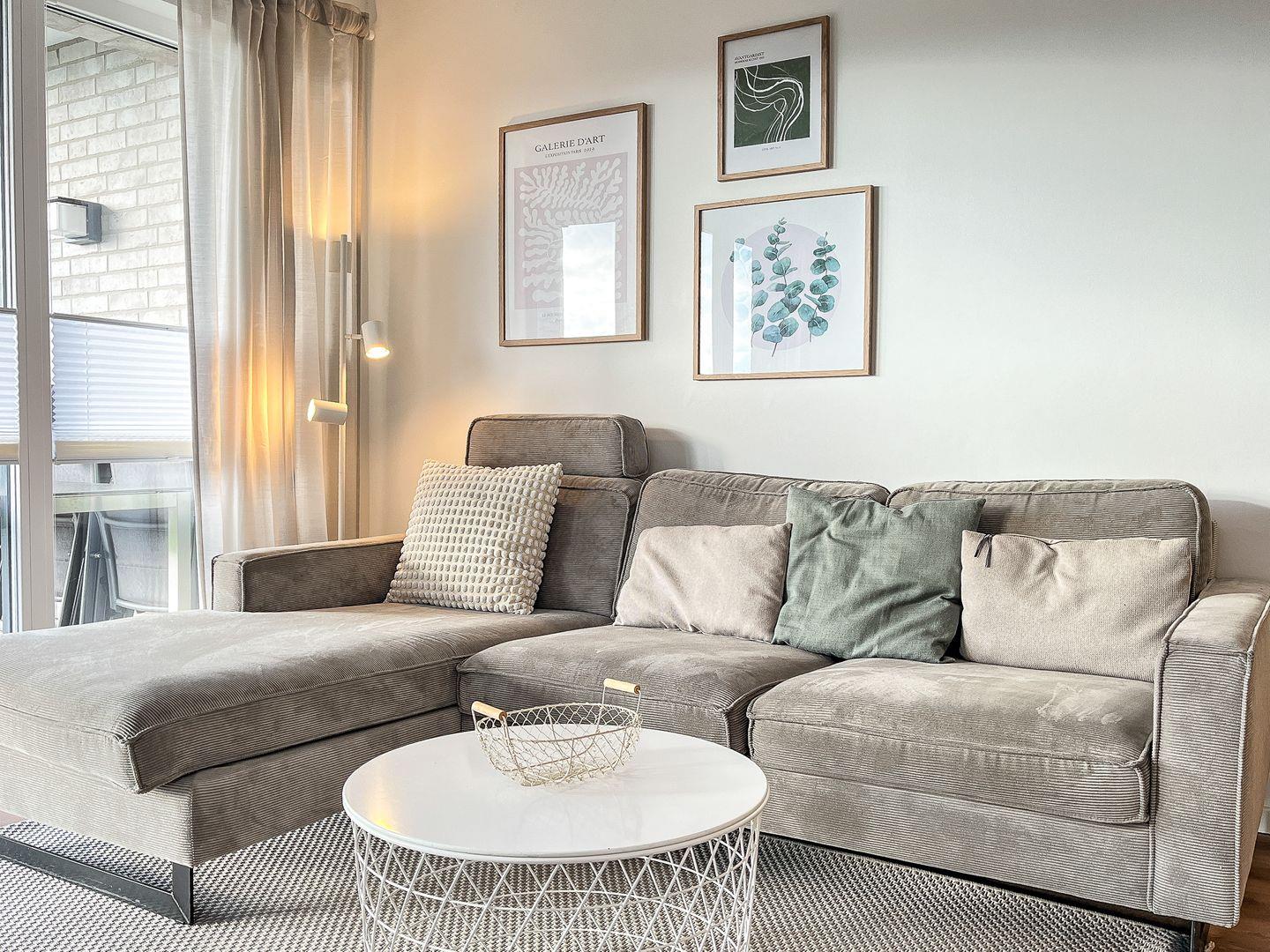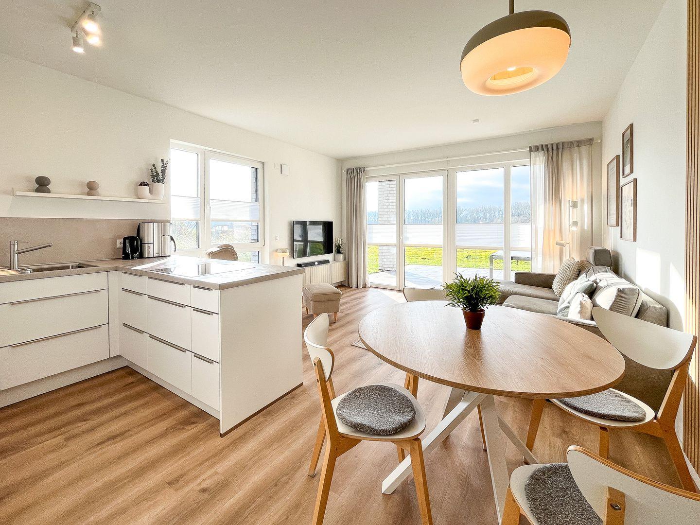 Deine ca. 69 m² große Ferienwohnung ist modern eingerichtet. Du verfügst über ein Wohnzimmer, eine Küche, zwei Schlafzimmer, ein Badezimmer sowie eine Terrasse. In der gesamten Wohnung wurde ein Vinylbelag verlegt. Das Badezimmer ist gefliest. Die Strandentfernung beträgt ca. 200 Meter.