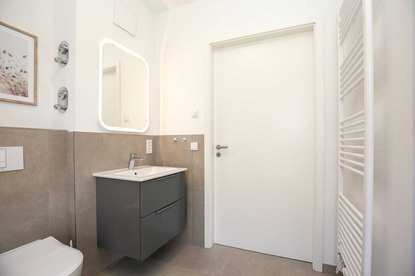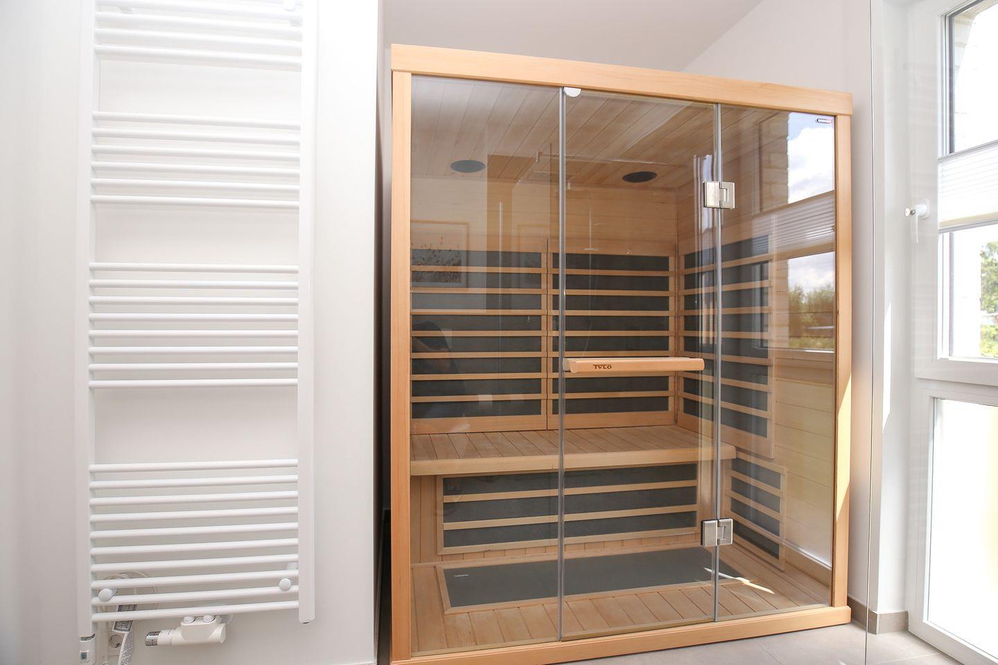 Das moderne Bad ist gefliest und mit einem Waschtisch, einer bodengleichen Dusche, einem WC sowie einem Handtuchheizkörper ausgestattet. Die im Bad integrierte Infrarotsauna steht dir kostenfrei zur Verfügung.