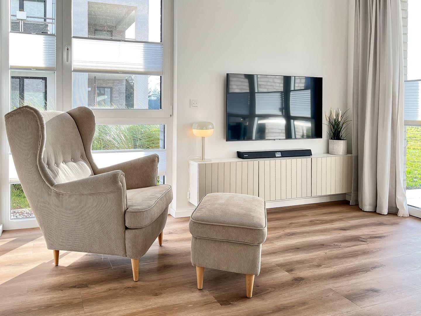 Zum Wohlfühlen und Entspannen lädt das Wohnzimmer ein. Zudem bieten dir die großen Fensterfronten ein großzügiges Wohngefühl. Neben der Standardausstattung des Wohnzimmers, wie zum Beispiel einer gemütlichen Couch, ist selbstverständlich ein Flachbildfernseher vorhanden. Vom Wohnzimmer aus gelangst du auf die möblierte Terrasse, die nach Süd/Westen ausgerichtet ist.
