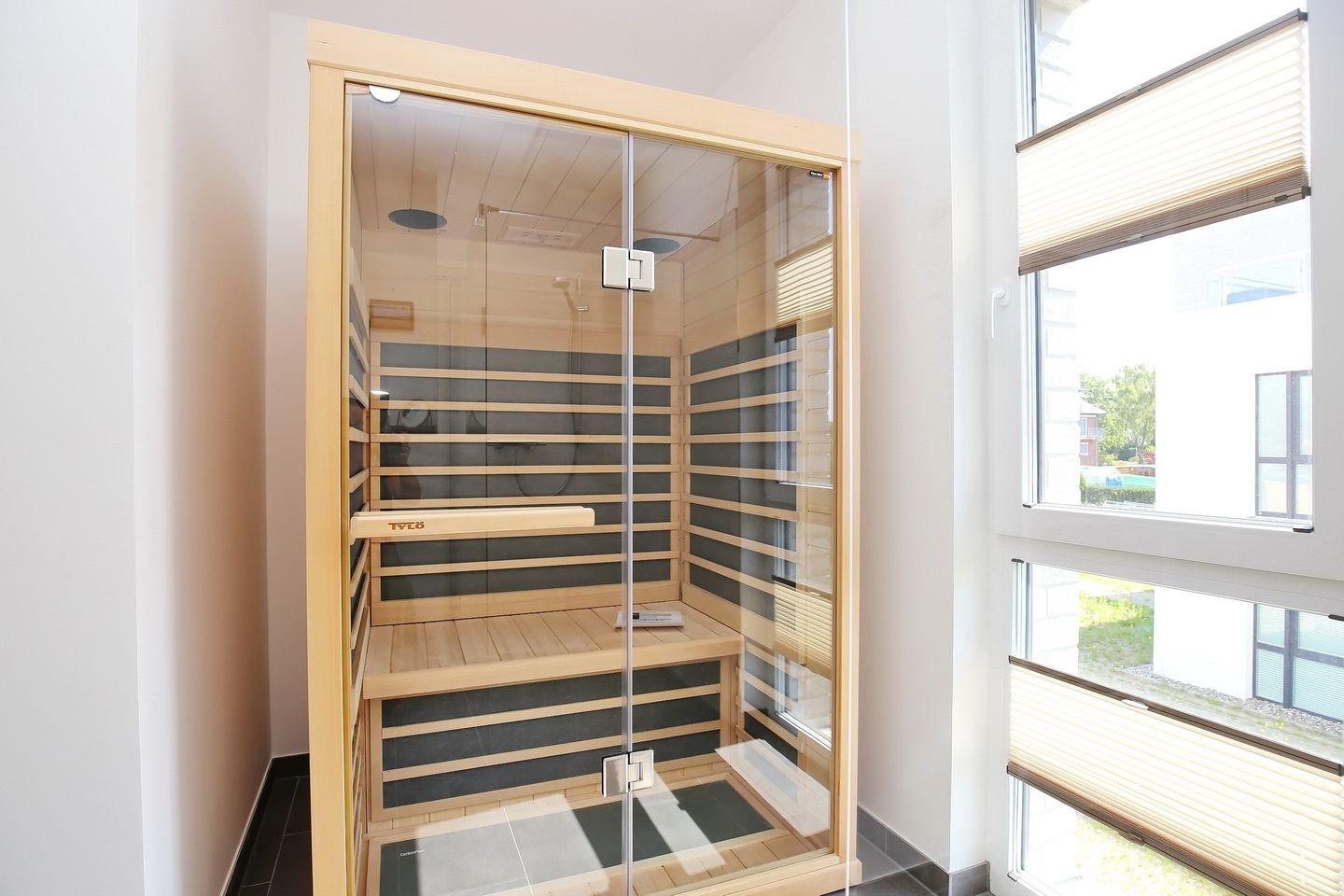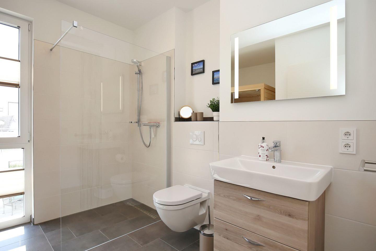 Das stilvolle Bad ist modern gefliest und mit einem Waschtisch, einer bodengleichen Dusche sowie einem WC ausgestattet. Die im Bad integrierte Infrarotsauna steht dir kostenfrei zur Verfügung.