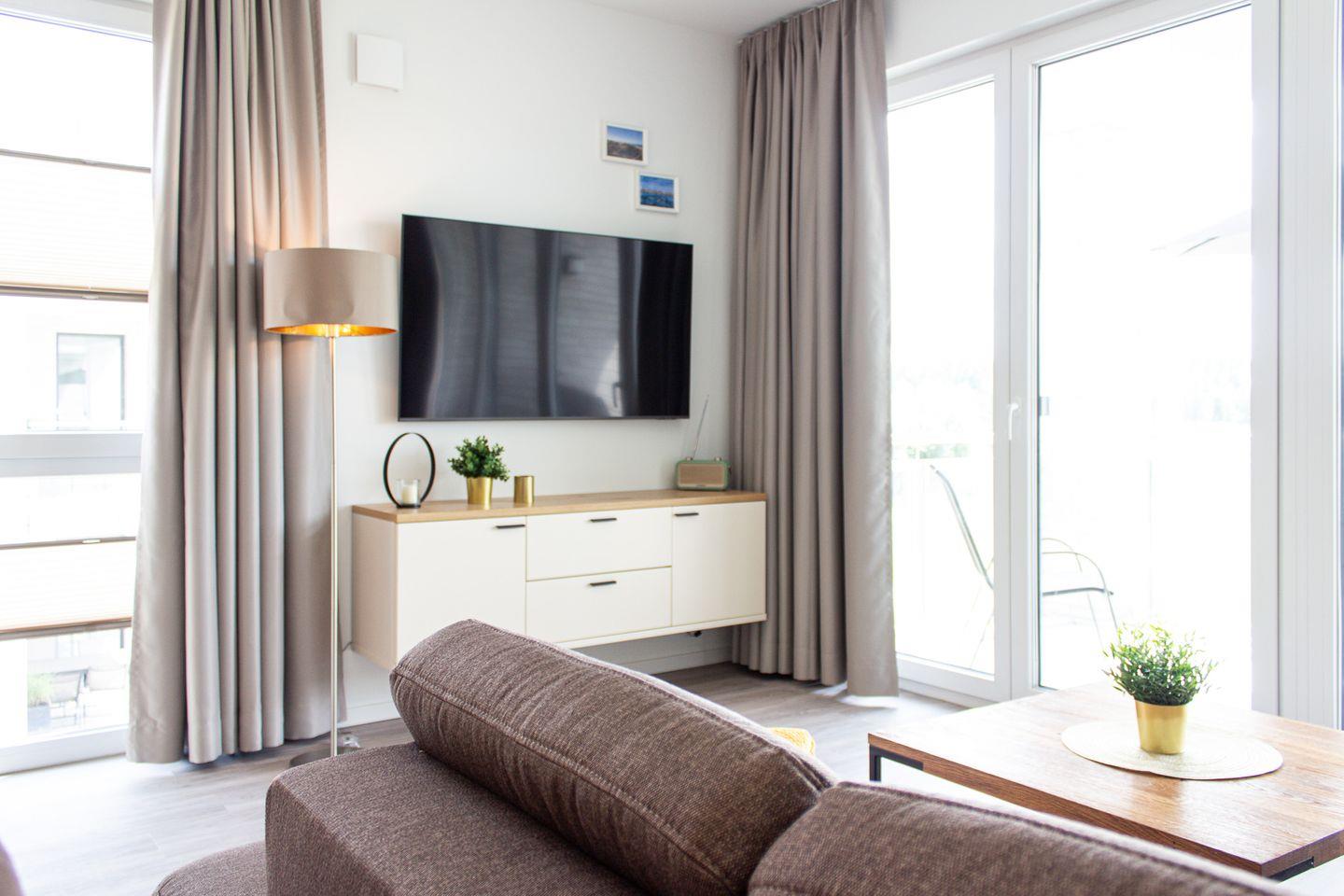Das Wohnzimmer lädt mit der gemütlichen Sofaecke zum Entspannen ein. Den Blick auf die Haffwiesen genießt du dank der großen Fensterfronten. Im Wohnzimmer steht dir selbstverständlich ein Flachbildfernseher (Smart-TV) zur Verfügung. Auch gelangst du vom Wohnzimmer aus auf den möblierten Balkon, der nach Süden ausgerichtet ist.