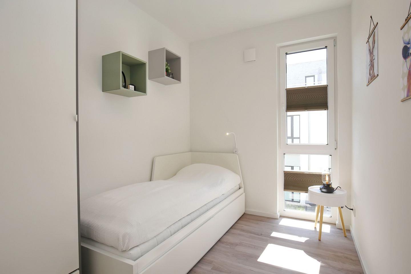 Im zweiten Schlafzimmer steht ein Einzelbett mit Bettschublade (2x 80 x 200 cm) zur Verfügung. Deine Kleidung kann im Kleiderschrank untergebracht werden.