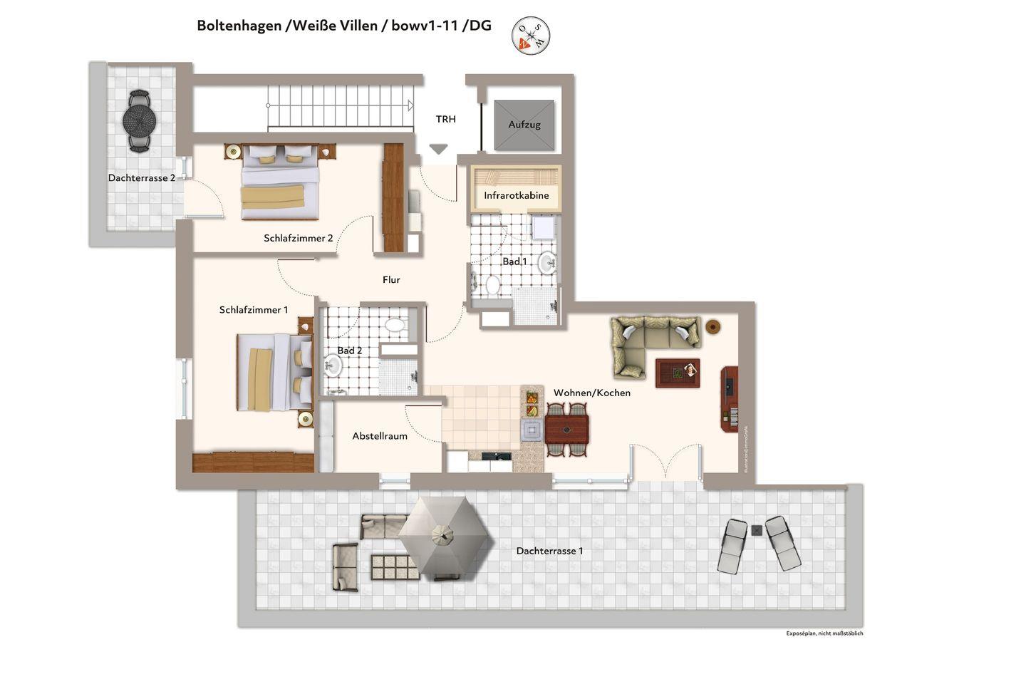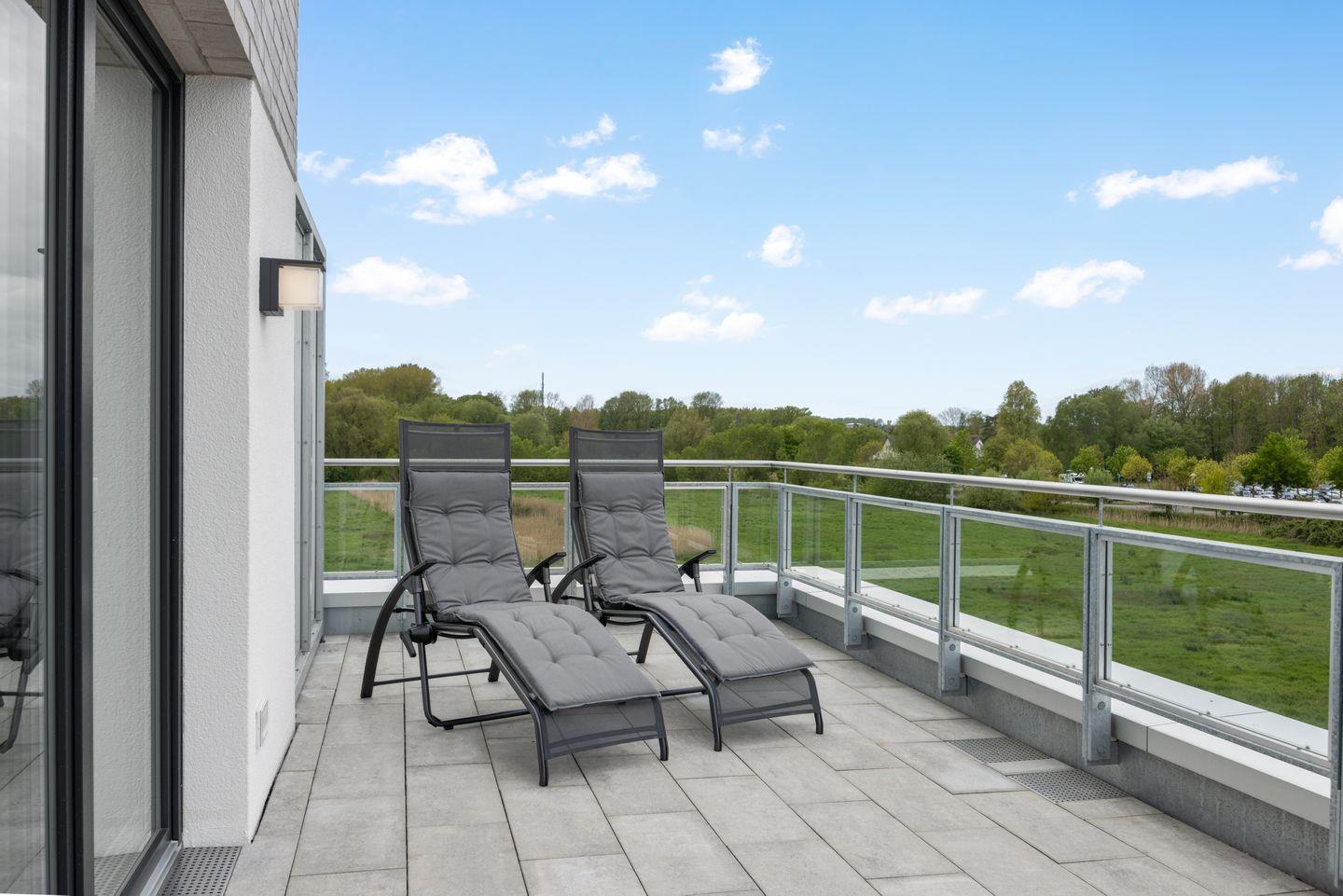 Das 100 m² große und exklusive 3-Zimmer Penthaus-Apartment ist für bis zu 6 Personen geeignet und mit zwei Schlafzimmern und zwei Bädern ideal für Familien. Besonders hervorzuheben ist die sonnige, großzügige Dachterrasse in südwestlicher Lage; hier könnt ihr bis zum Abend die Sonne und das milde Klima der Ostsee genießen. Das Apartment verfügt über eine eigene Infrarotsauna!