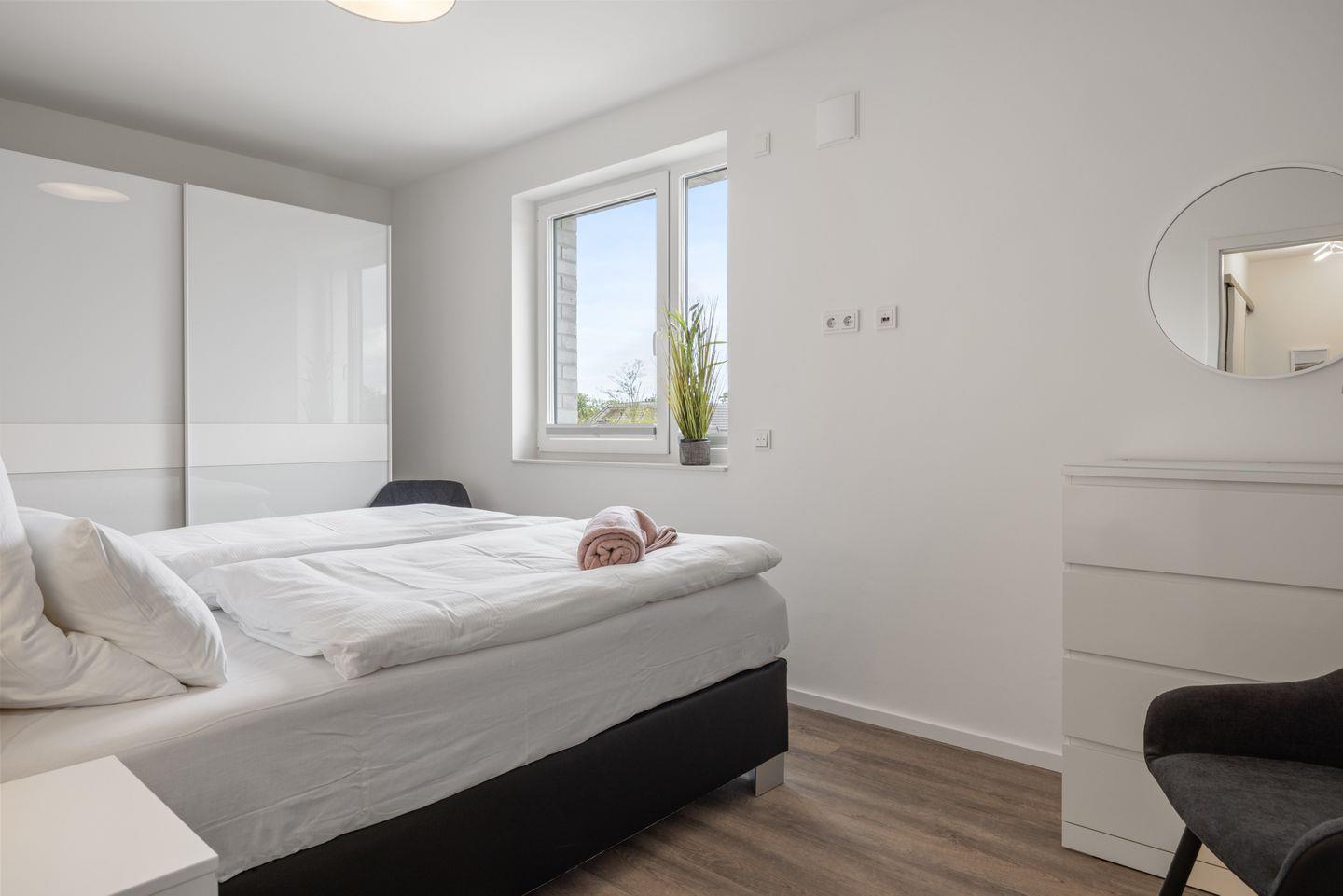 Zwei separate Schlafzimmer sind jeweils mit einem modernen Boxspringbett (1,80 x 2,00 m) und Kleiderschrank ausgestattet. Eines der beiden Schlafzimmer verfügt über eine eigene kleine Dachterrasse. Ein Kinderbett kann gegen Entgelt in den Schlafzimmern aufgestellt werden und ein Hochstuhl steht kostenfrei zur Verfügung.