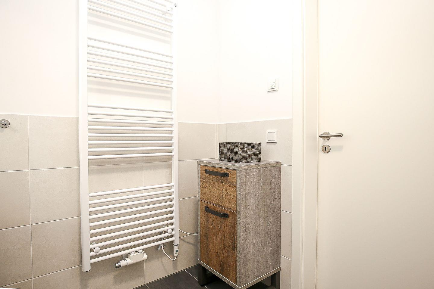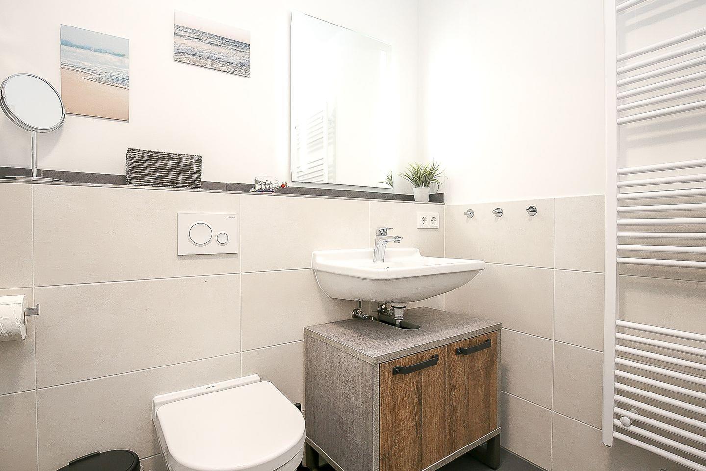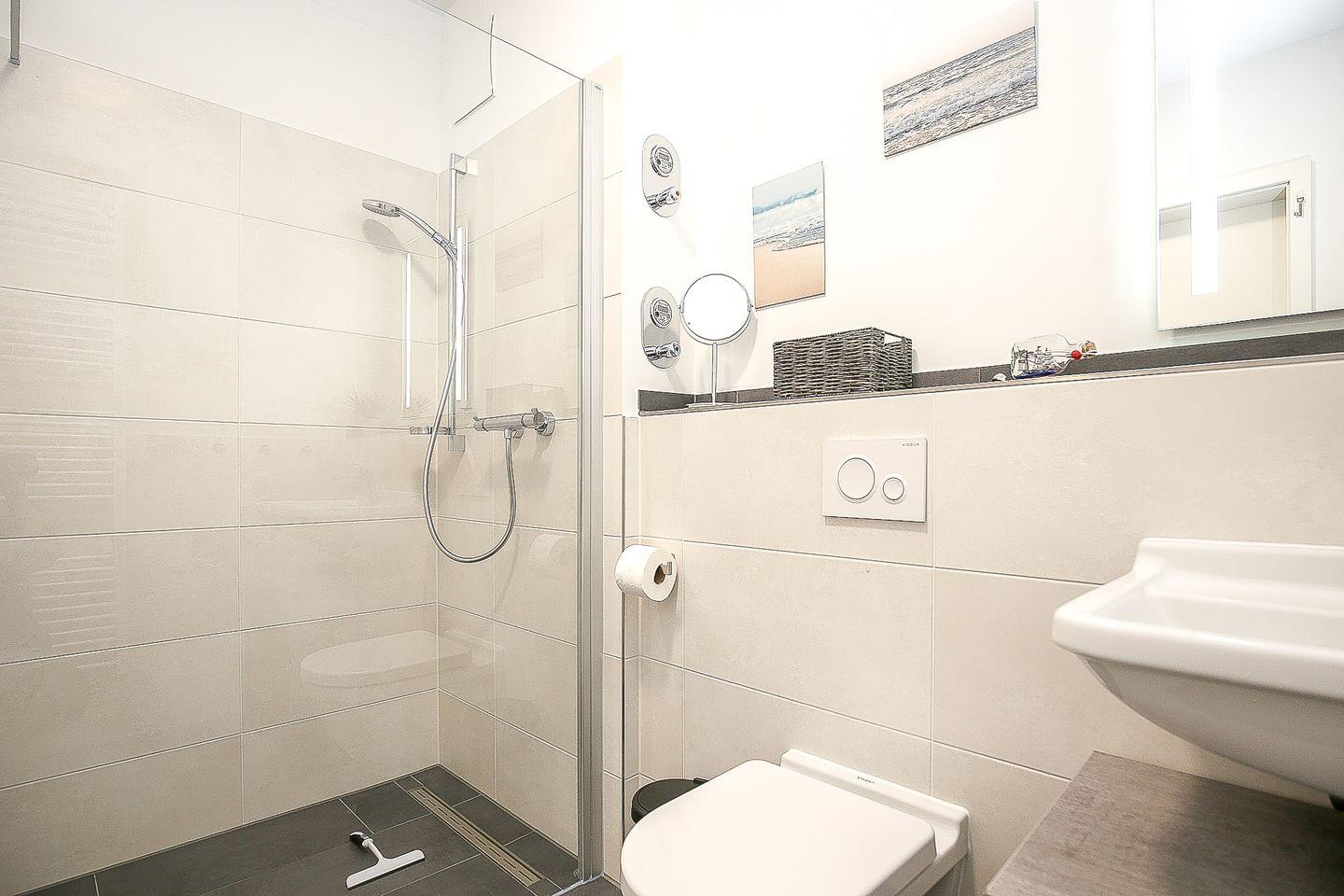 Das stilvolle Bad ist modern gefliest und mit einem Waschtisch, einer bodengleichen Dusche sowie einem WC ausgestattet.
