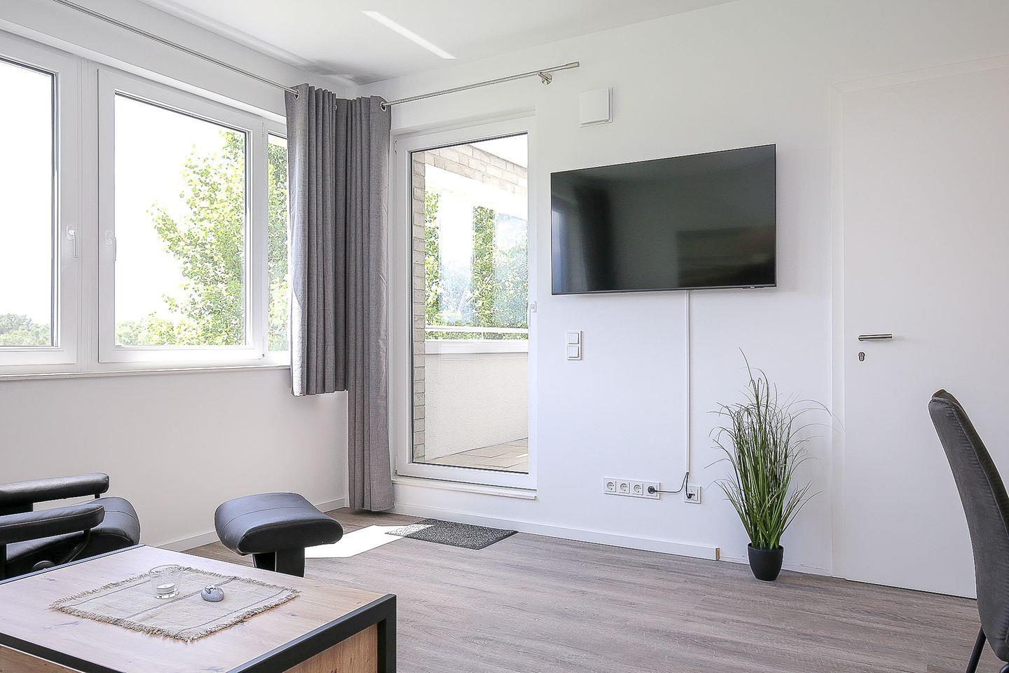 Das Wohnzimmer lädt mit der gemütlichen Sofaecke zum Entspannen ein. Den Blick auf die Haffwiesen genießt du dank der großen Fensterfronten. Im Wohnzimmer steht dir selbstverständlich ein Flachbildfernseher zur Verfügung. Auch gelangst du vom Wohnzimmer aus auf den möblierten Balkon, der nach Süden ausgerichtet ist.
